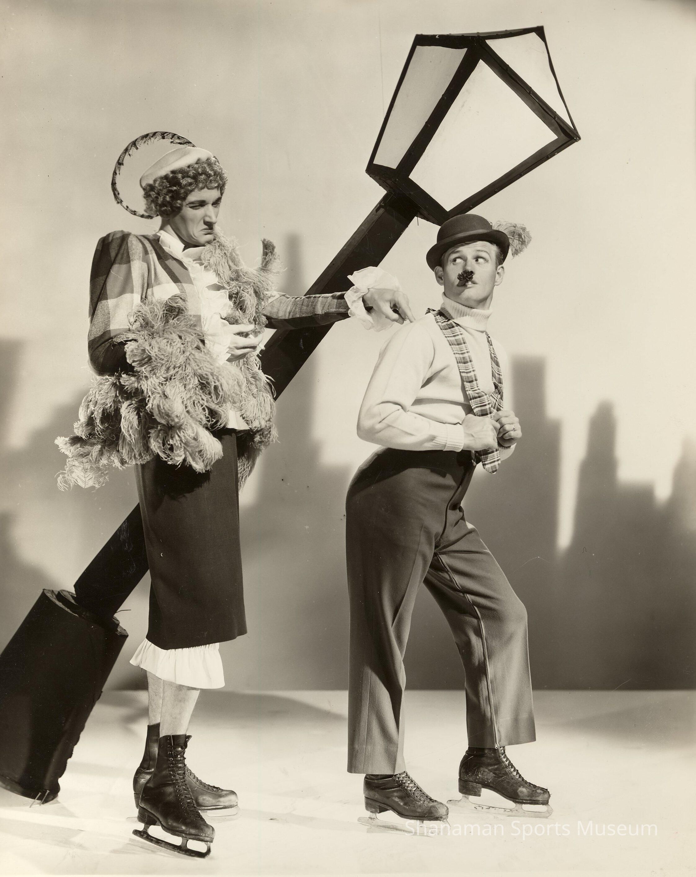 Dick Rasmussen (left) and Bill Cameron are in costume for a publicity shot of the skit “The Bowery” from a 1950 Ice Follies performance at the Lakewood Ice Arena. The Ice Follies were the precursor to the Ice Capades which featured elaborate production numbers and costumes and later include several Olympians and world champion skaters. By 1955 the show had eight performances and 175 skaters. The rink also became the entertainment hub for Tacoma area residents since its opening in 1938 and continued until 1982 when part of the building collapsed and the rest was demolished.