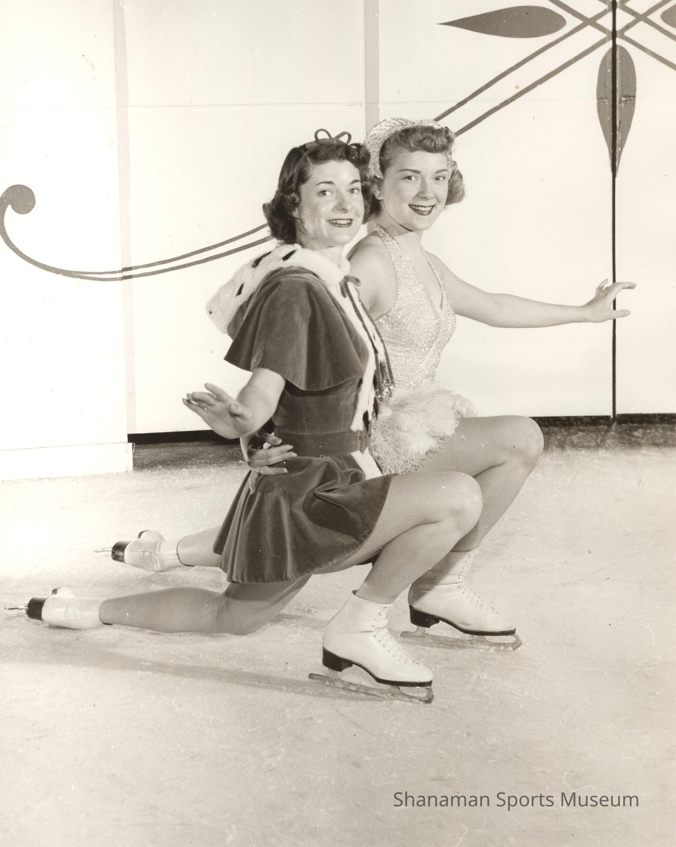 Lois Secreto and Diane Jacobsen pose together on the ice at the Lakewood Ice Arena. Secreto won the Northwest Novice Ladies title followed by the Northwest Senior title in 1947 and a second Pacific Coast Senior Ladies title in 1950. That win qualified her for the national championships where she tied for first place in the freestyle skating event. Jacobsen was one of the numerous young skaters that called the ice arena home. As a member of the Lakewood Figure Skating Club, Jacobsen was under the tutelage of national coaches and went on to perform in numerous ice shows.