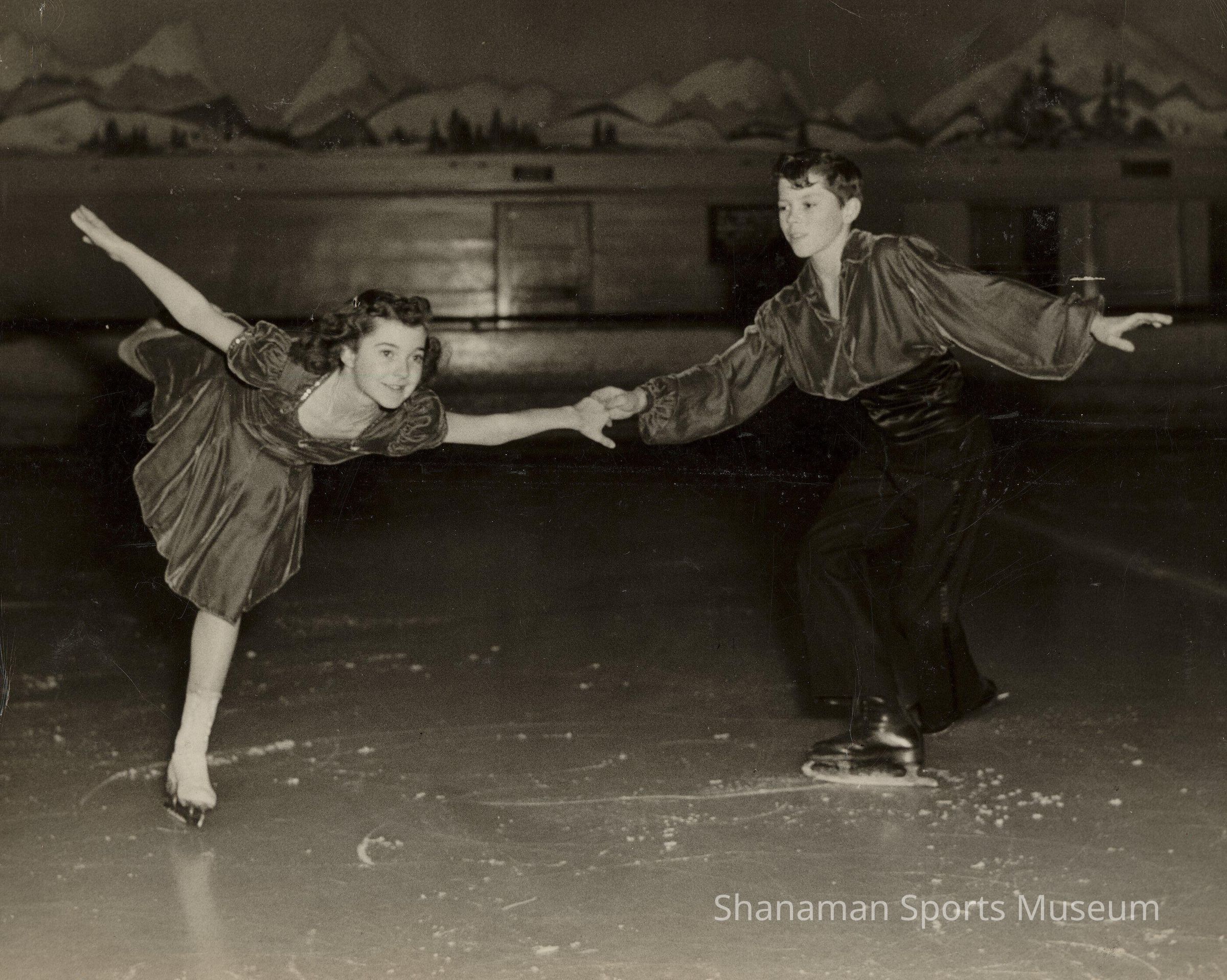 Lois Secreto and Jimmy Grogan, ages 12 and 13 respectively, skate at the Lakewood Ice Arena. Secreto won the Northwest Juvenile Girls title in 1942, teamed with Jimmy Grogan in 1945 and won the Pacific Coast Junior Pairs Competition. She was also second in the Junior Girls event. In 1946, Secreto won the Northwest Novice Ladies title followed by the Northwest Senior title in 1947 and a second Pacific Coast Senior Ladies title in 1950. That win qualified her for the national championships where she tied for first place in the freestyle skating event. After graduating from Stadium High School, Secreto joined the Shipstads and Johnson Ice Follies. Photo by Jim Brummett.