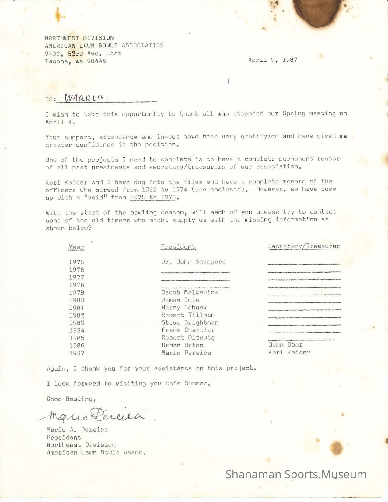 Letter from the president of the NW Division of American Lawn Bowls Association (ALBA) to attendees at the 1987 Spring meeting.