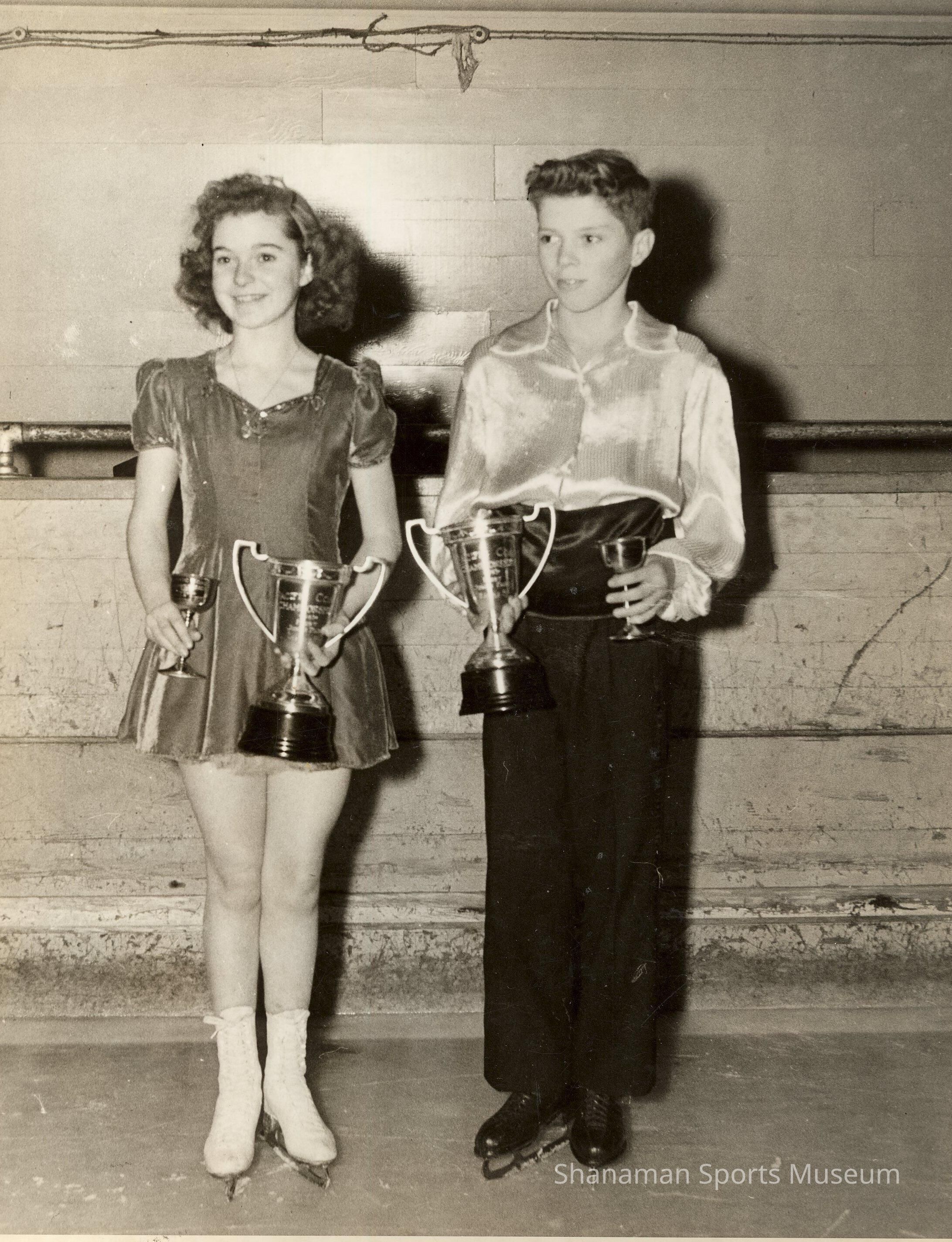 Lois Secreto posed with Jimmy Grogan stands with their trophies for winning the1945 Pacific Coast Jr. Pairs title in Seattle, WA. Lois also took second place in the Juvenile Girls event and Jimmy also placed in another event as well. Lois Secreto and Jimmy Grogan began skating together as children at Lakewood Ice Arena. The pair won the 1945 to win the Pacific Coast Junior Pairs Competition. Secreto, who also won the Northwest Juvenile Girls title in 1942 and in 1946, Secreto won the Northwest Novice Ladies title followed by the Northwest Senior title in 1947 and a second Pacific Coast Senior Ladies title in 1950. That win qualified her for the national championships where she tied for first place in the freestyle skating event. After graduating from Stadium High School, Secreto joined the Shipstads and Johnson Ice Follies. Grogan won earned numerous junior and senior trophies before he went on to become a two-time Olympian, a four-time world silver medalist and U.S. champion. He also went on to star in the Hollywood Ice Revue and the Ice Capades and inducted into the U.S. Figure Skating Hall of Fame.