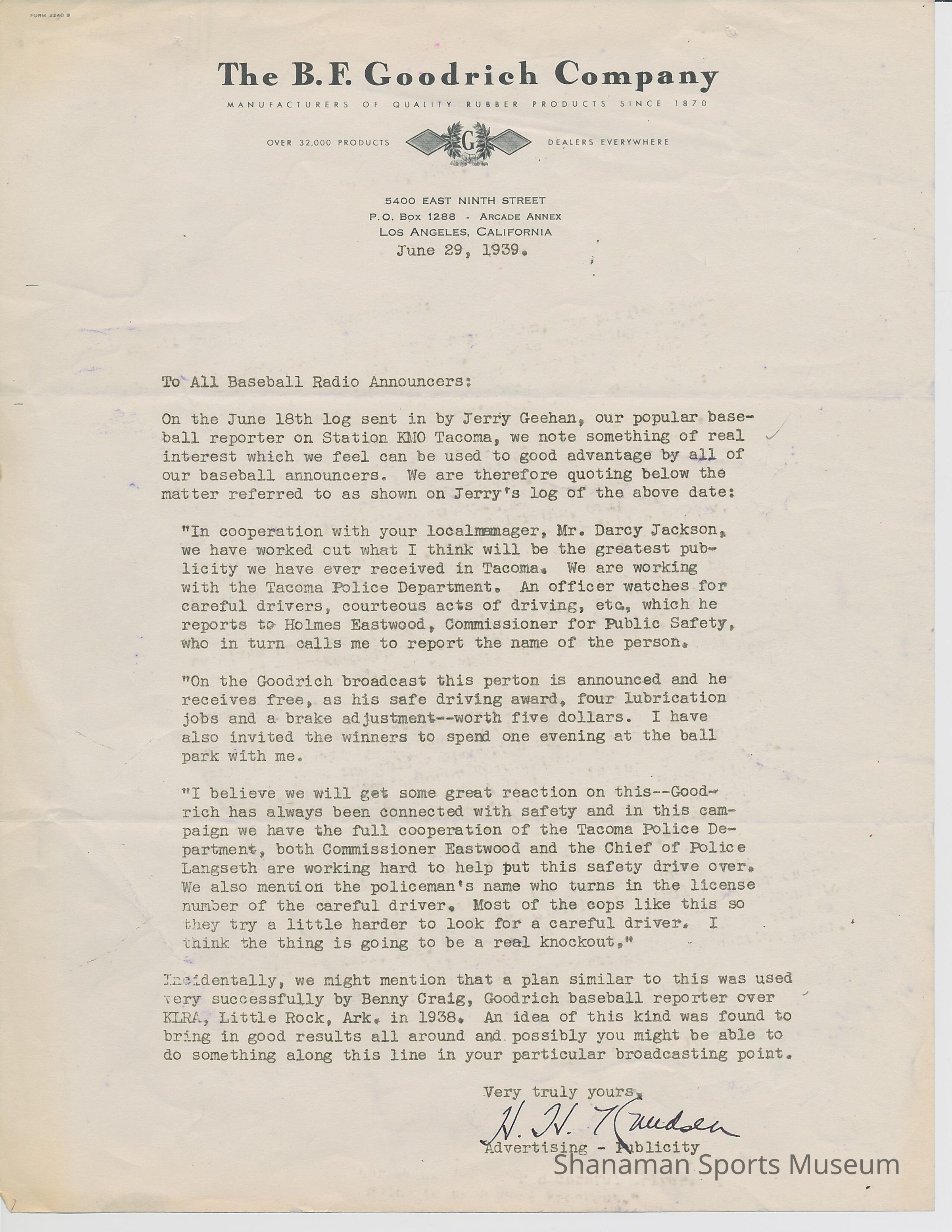 Letter from BF Goodrich Co to all Baseball Radio Announcers; June 29, 1929