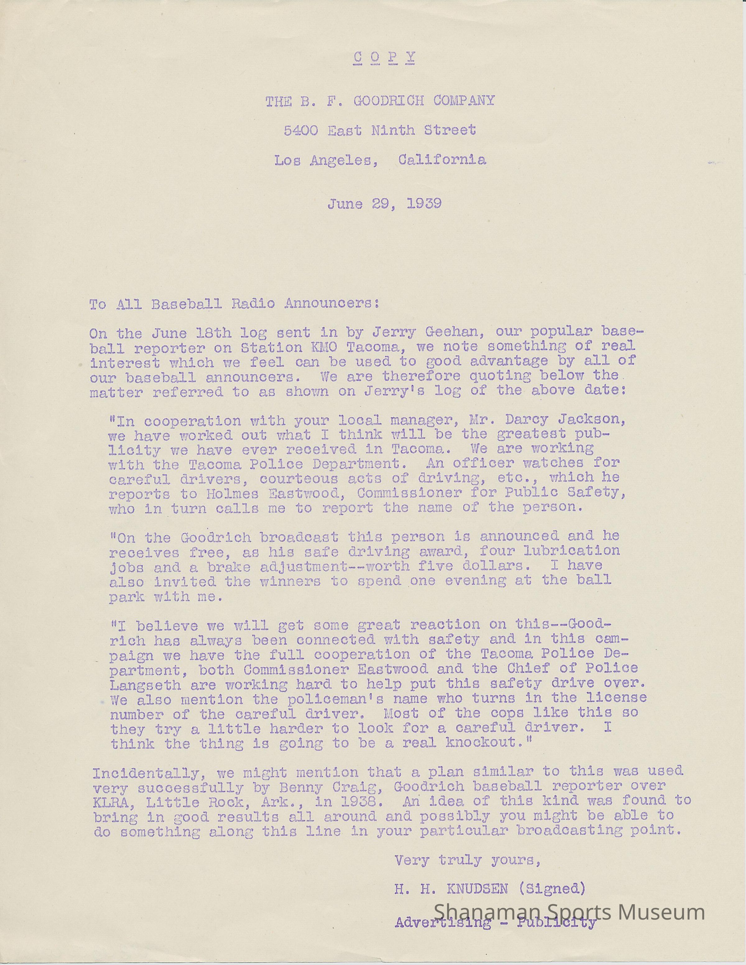 Announcement from BF Goodrich Co to all Baseball Radio Announcers; June 29, 1929
