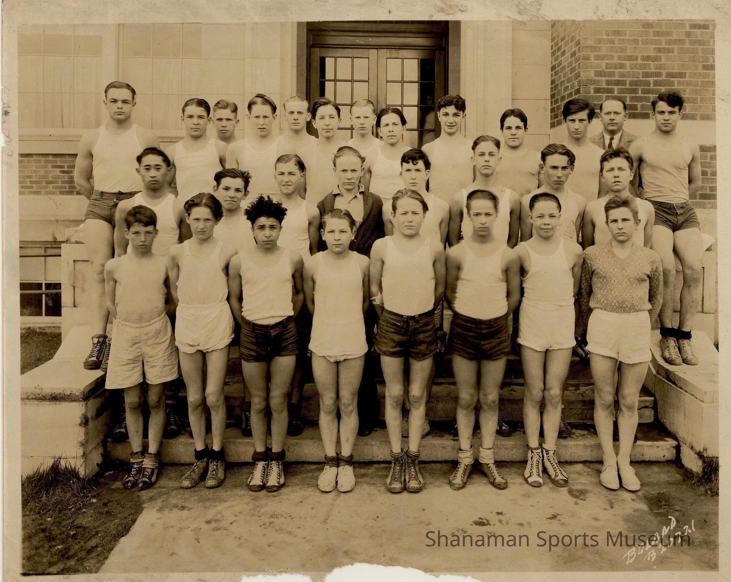 Photo, b/w, Stewart Junior High (?) sports team or gym class. 28 boys. Howard Olson is 3rd from left, back row. Photo by Boland.Lexicon