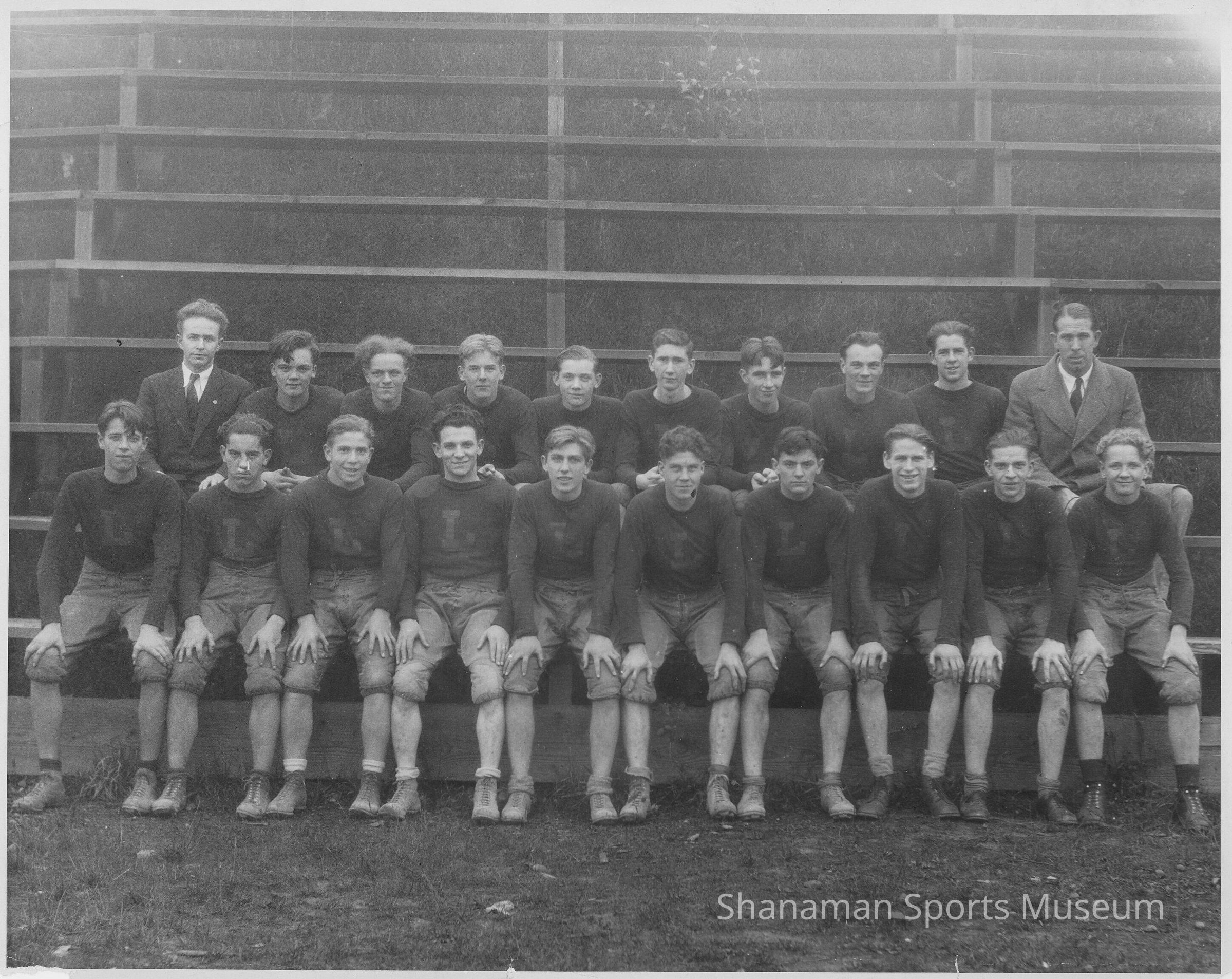 Eighteen players and two coaches for the 1931 Lincoln High School junior varsity football team, wearing dark sweaters with an "L" on their chest, pose for a team photograph. Identified players in the photo are Orv Berg and Leonard Brunstad.
