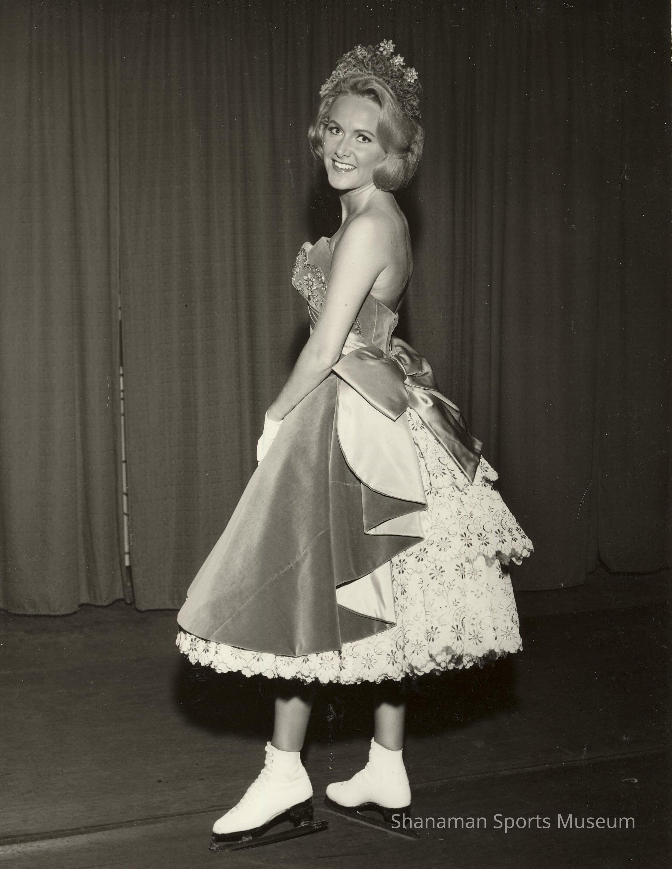 Nancy Roberts poses in a beautiful costume for a 1964 Ice Follies show. Roberts performed with the Follies from 1959-1965. The Ice Follies were the precursor to the Ice Capades which featured elaborate production numbers and costumes and later include several Olympians and world champion skaters. By 1955 the show had eight performances and 175 skaters. The rink also became the entertainment hub for Tacoma area residents since its opening in 1938 and continued until 1982 when part of the building collapsed and the rest was demolished. Photo by David M. Mills, Los Angeles.