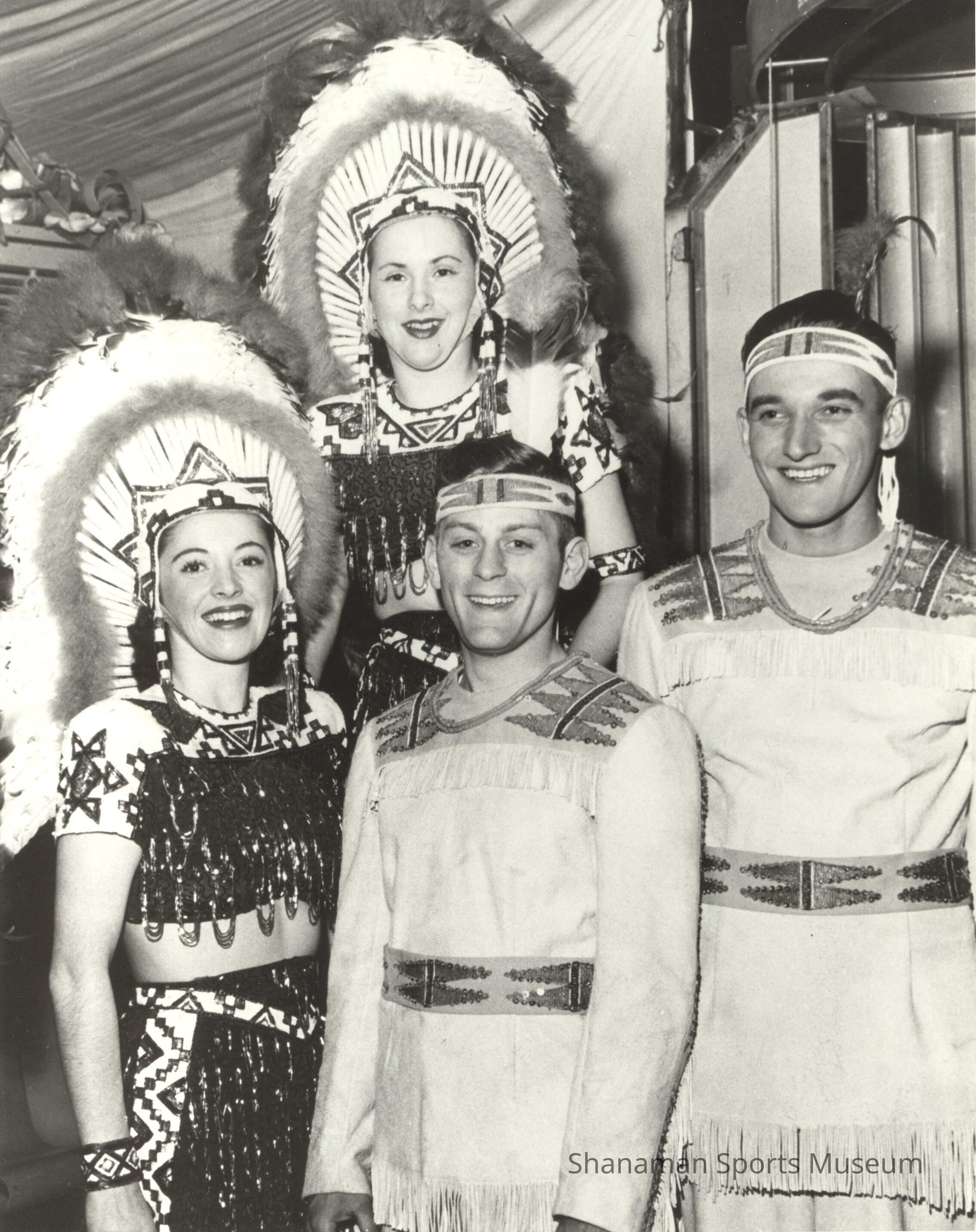 Patty Hoyt, Shirley Smith, John Mulvey (center) and Dick Rasmussen pose in Native American costumes from a 1950 Ice Follies performance called “The Totem Ceremonial Dance” at the Lakewood Ice Arena. The Ice Follies were the precursor to the Ice Capades which featured elaborate production numbers and costumes and later include several Olympians and world champion skaters. By 1955 the show had eight performances and 175 skaters. The rink also became the entertainment hub for Tacoma area residents since its opening in 1938 and continued until 1982 when part of the building collapsed and the rest was demolished.