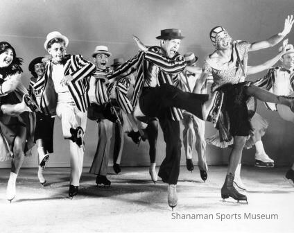 Photo, b/w, "The Roaring Twenties" number from the 1951 Ice Follies. In front l to r: John Mulvey, Bill Cameron and Dick Rasmussen (in woman's costume). Chorus of men and women behind including Wayne Earley and Bill Boyle. All are kicking their right leg in the air.