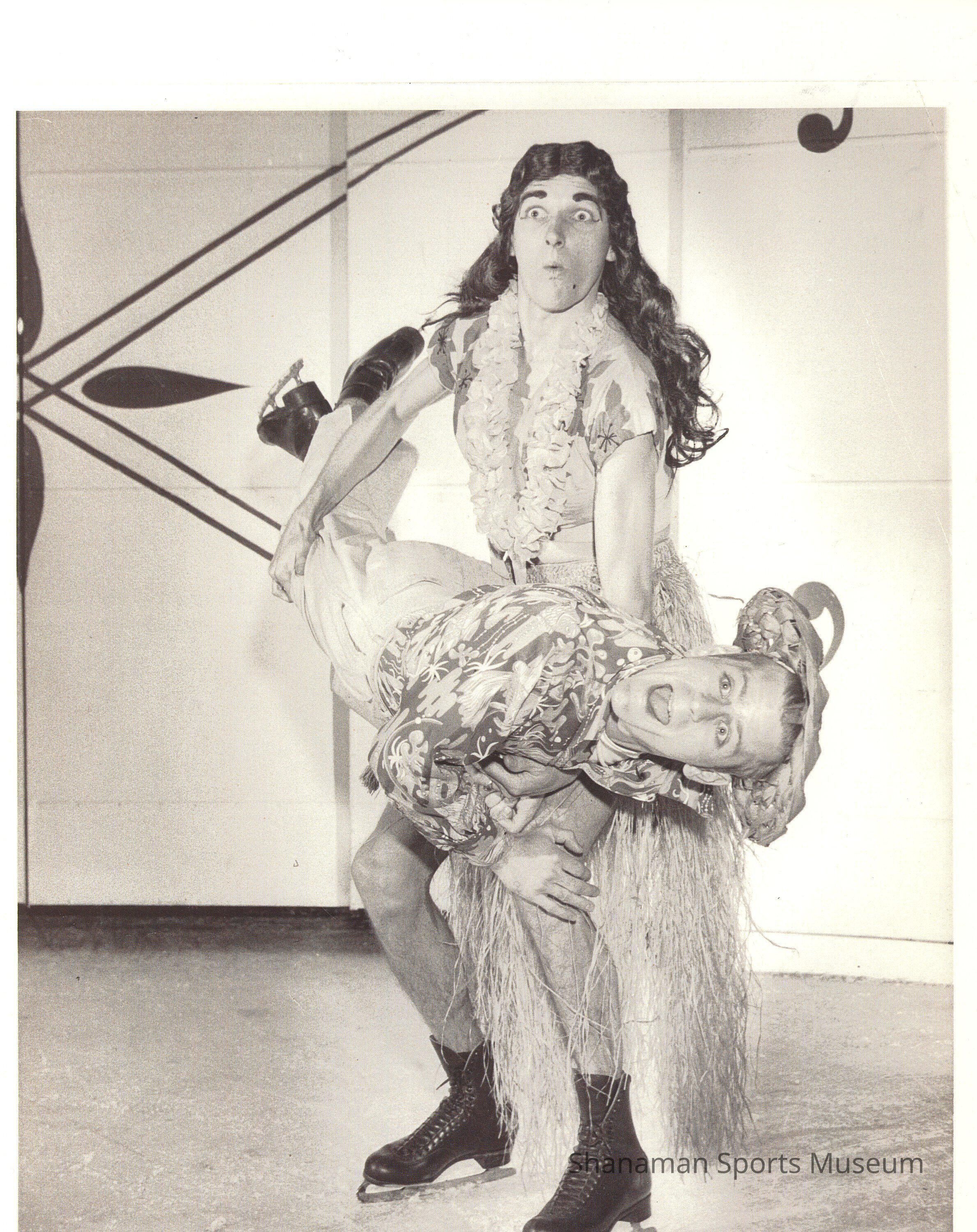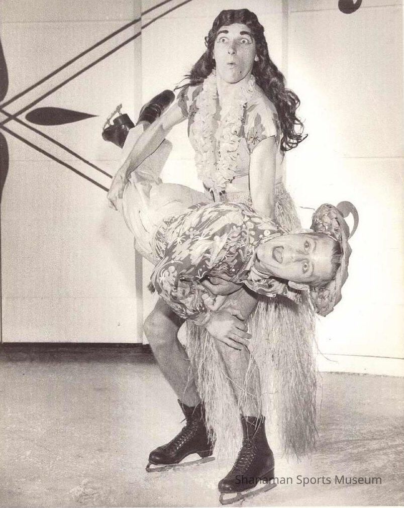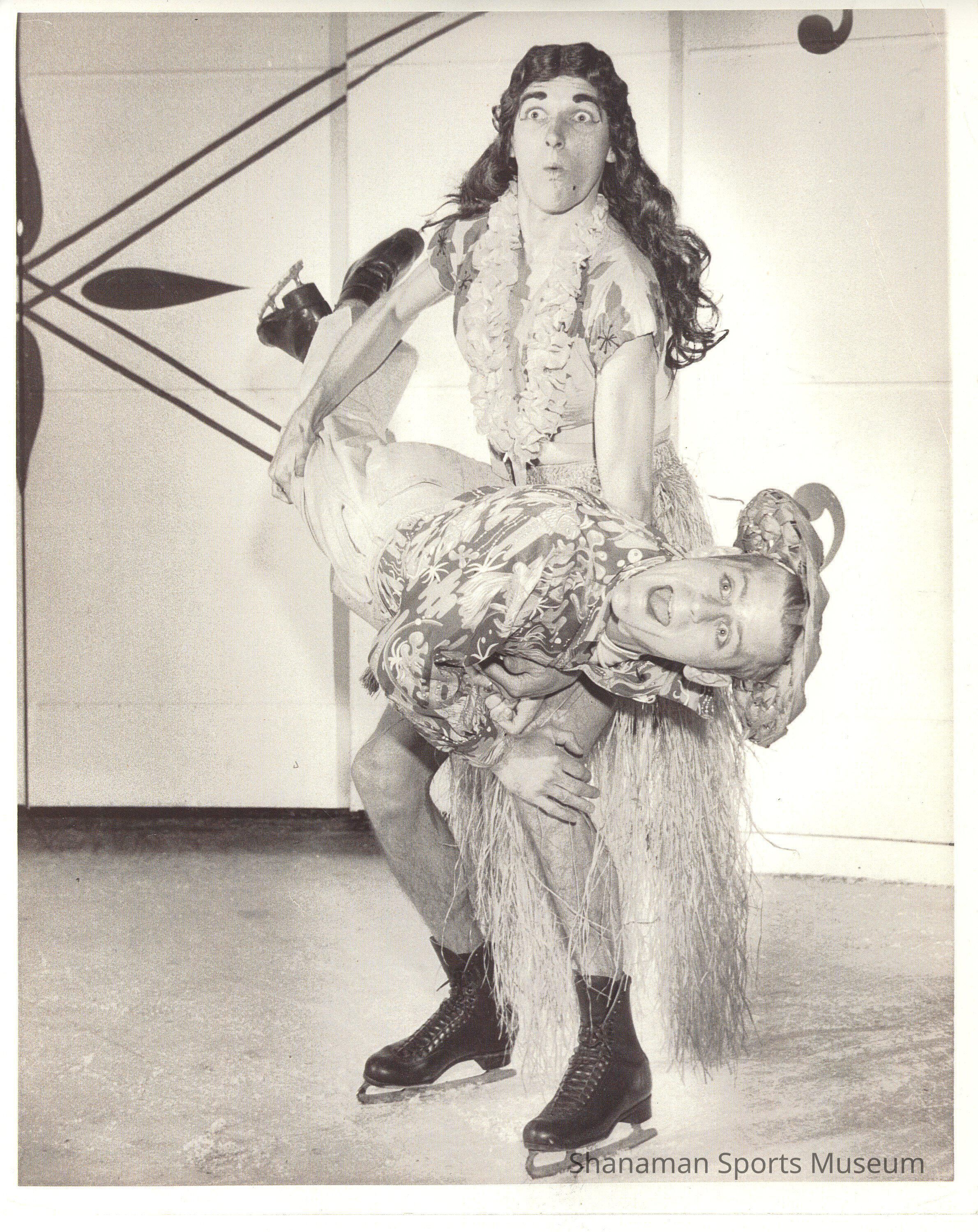 Dick Rasmussen holds John Mulvey for a 1950 Ice Follies aloha comedy skit at the Lakewood Ice Arena. The Ice Follies were the precursor to the Ice Capades which featured elaborate production numbers and costumes and later include several Olympians and world champion skaters. By 1955 the show had eight performances and 175 skaters. The rink also became the entertainment hub for Tacoma area residents since its opening in 1938 and continued until 1982 when part of the building collapsed and the rest was demolished.