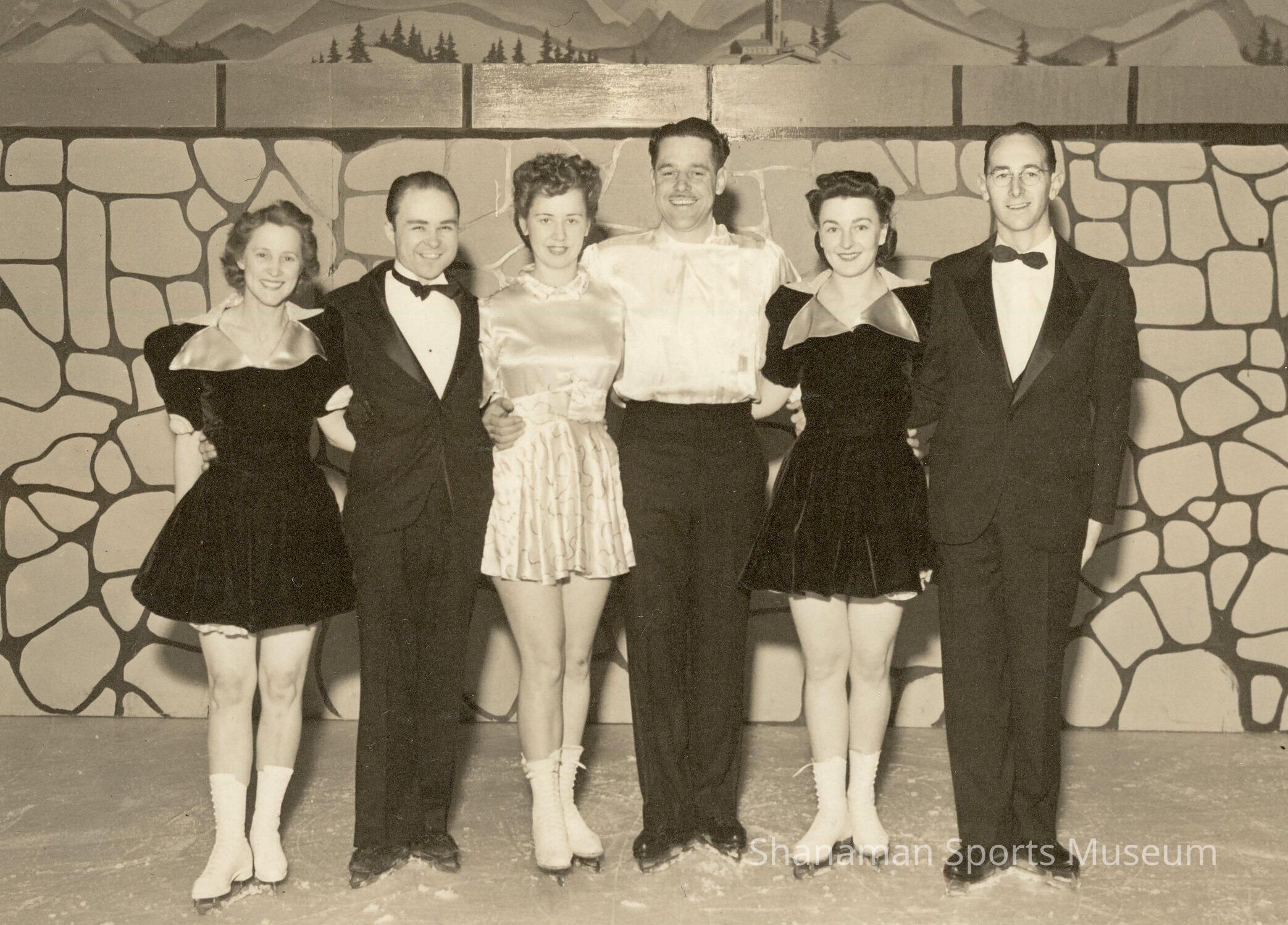 Skaters pose on the ice at the Lakewood Ice Arena. The ice arena was home to many top level skaters when it opened in the 1930s. It was a popular hangout spot for families and couples, and teenagers. Among those pictured in the photo are Ed Stevens, Margaret Kliese-Brooks, Ray Gamble, and Alida Stevens (all ID'd on back of photo)