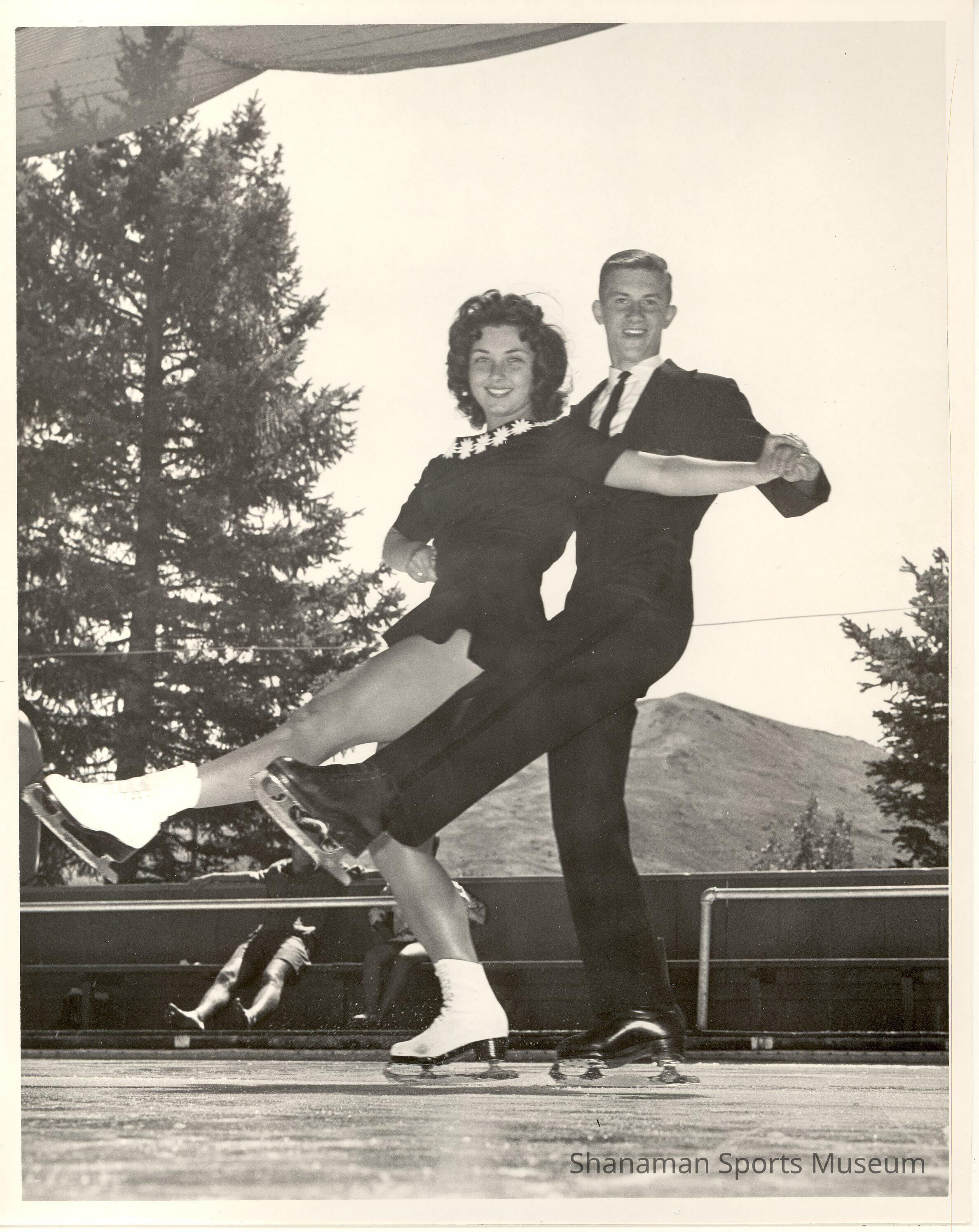 Patty Gilroy and Buddy Zack skate together in Sun Valley, Idaho. Gilroy, a figure skater from Tacoma, won the 1958 Pacific Coast Championships in Novice Ladies. She also earned gold in US Figure Skating Association in three disciplines, figures, dance and CFSA dance.Lexicon
