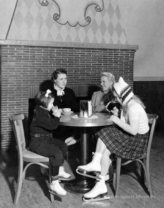 The Lakewood Ice Arena was home to many top level skaters when it opened in the 1930s. It was a popular hangout spot for families and teenagers, as shown in the picture of two women and two girls seated around a table in front of a large fireplace at the snackbar. Photo by Associated Photographic Service, Tacoma.Made/Created