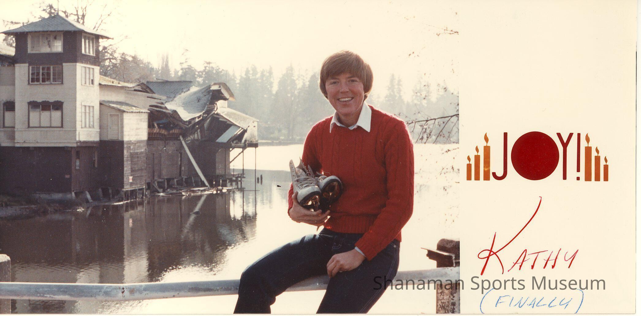 With a collapsed Lakewood Ice Arena in the background, skating coach Kathy Casey sits on a railing holding a pair of ice skates as she poses for a picture used on a photo Christmas card. The Lakewood Ice Arena collapsed on Oct. 1, 1982. Kathy has signed the card.Made/Created
