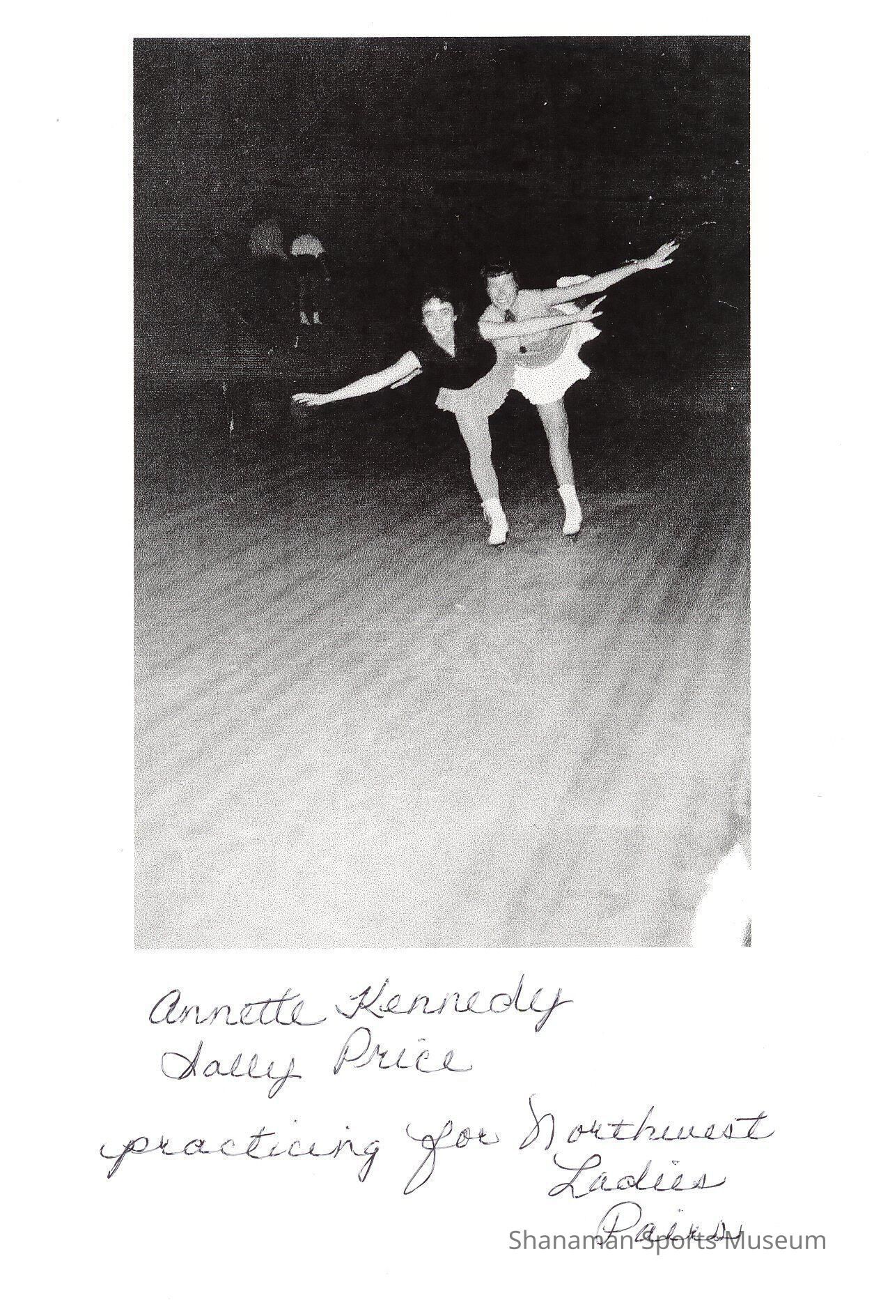 Annette Kennedy and Sally Price practice skating for the Northwest Ladies Pairs competition. They both gracefully glided along on one skate with their arms outstretched. Price was a frequent performer and competitor in skating. She competed in the Pacific Coast Competition. In 1961, Price performed with the Ice Follies and with the Top Hat Chorus Line.Lexicon