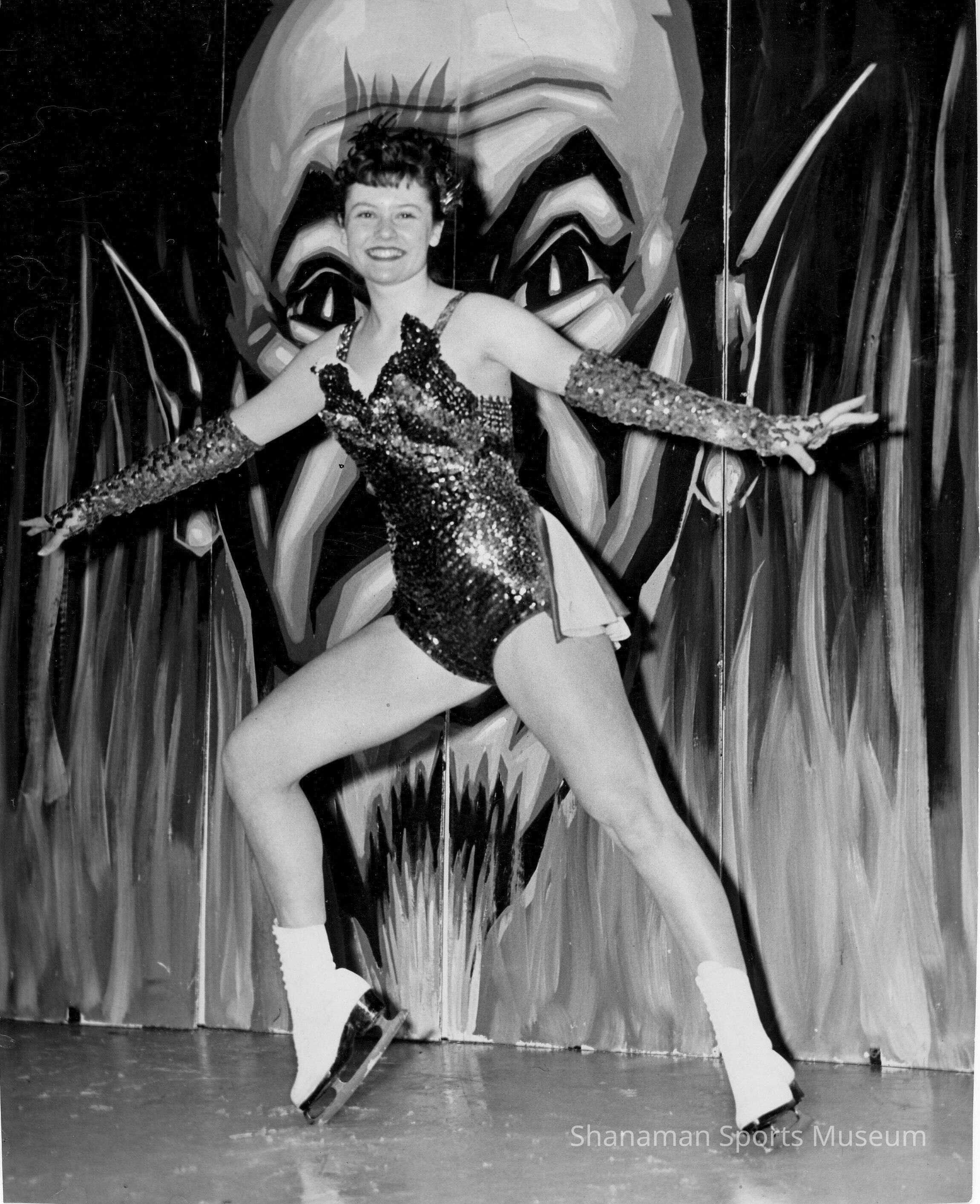 Joby Moore Cleary poses wearing a sequined costume from the Ice Capers show in 1952 at the Lakewood Ice Arena. Moore and partner Shirley Givens won the Pacific Northwest Ladies Pair title in the early 1950s. The arena was home to many top level skaters when it opened in the 1930s. By 1955 the show had eight performances and 175 skaters. The rink hosted numerous shows and was the entertainment hub for Tacoma residents until 1982 when part of the building collapsed and the rest was demolished.