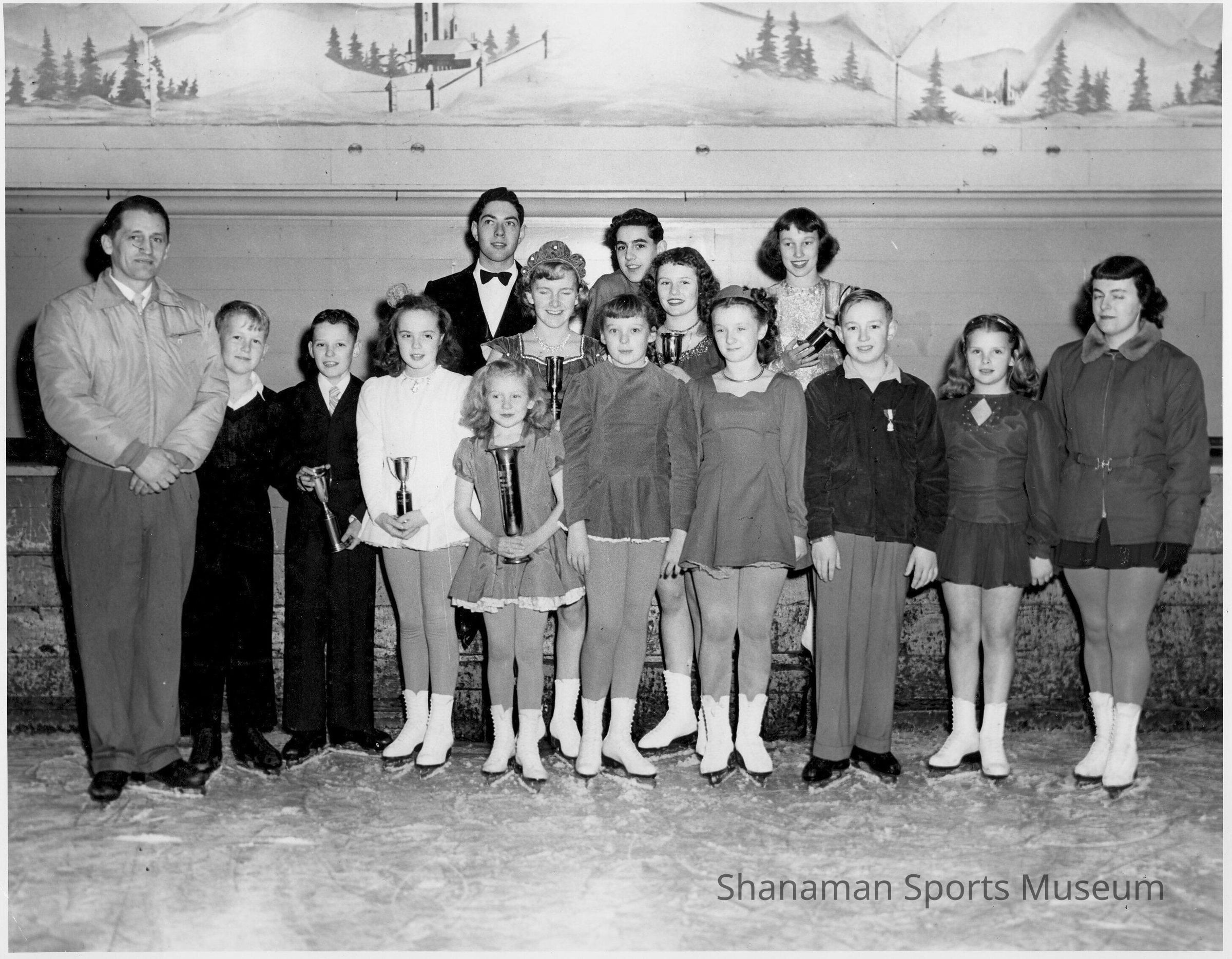 A group of young skaters pose on ice at the Lakewood Ice Arena, including Tom Moore (third from left). The arena was the place to be for Tacoma residents. It quickly became an entertainment hub when it opened in 1938. The rink continued to provide skating lessons, was a popular hangout spot for teenagers, offered skating parties and hosted the Ice Follies and Ice Capades until part of the building collapsed in 1982 and the rest was demolished shortly thereafter.Made/Created