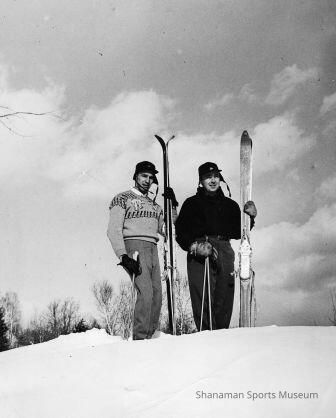 Photograph, b/w, original. Joe LaPorte and Fred Conners pose with skis on snowy slope. St. Johnsburg, VT 1947. Photo caption "the only hill around. Helped teach for couple wks"Relationships