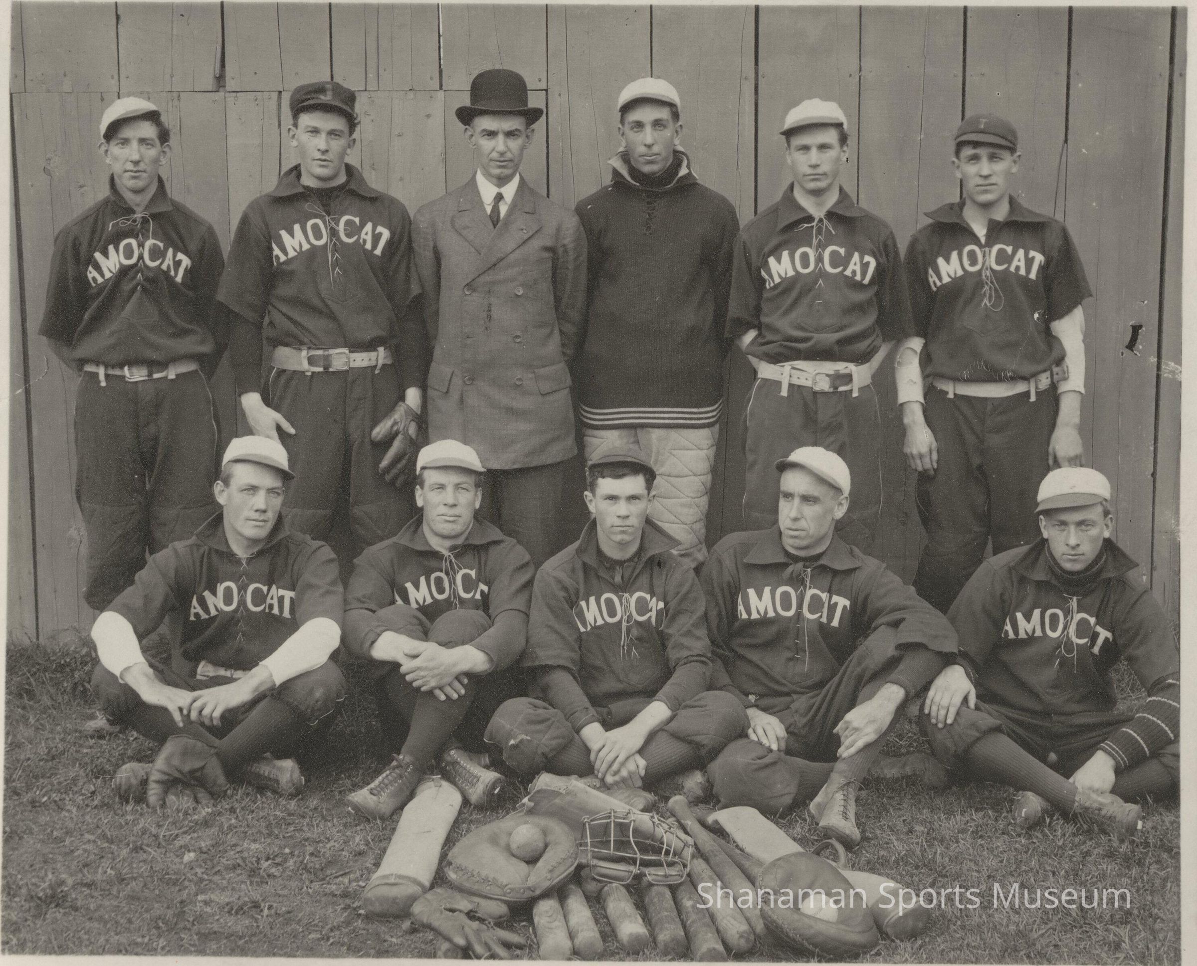 Photograph, copy print, b/w. Team photo of Amocat team. 10 players in uniform and coach in suit, baseball equipment in front of team.Relationships