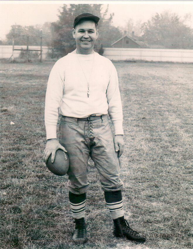 Puyallup High School coach Carl Sparks holds a football as he stands in Viking Field in the 1940s.