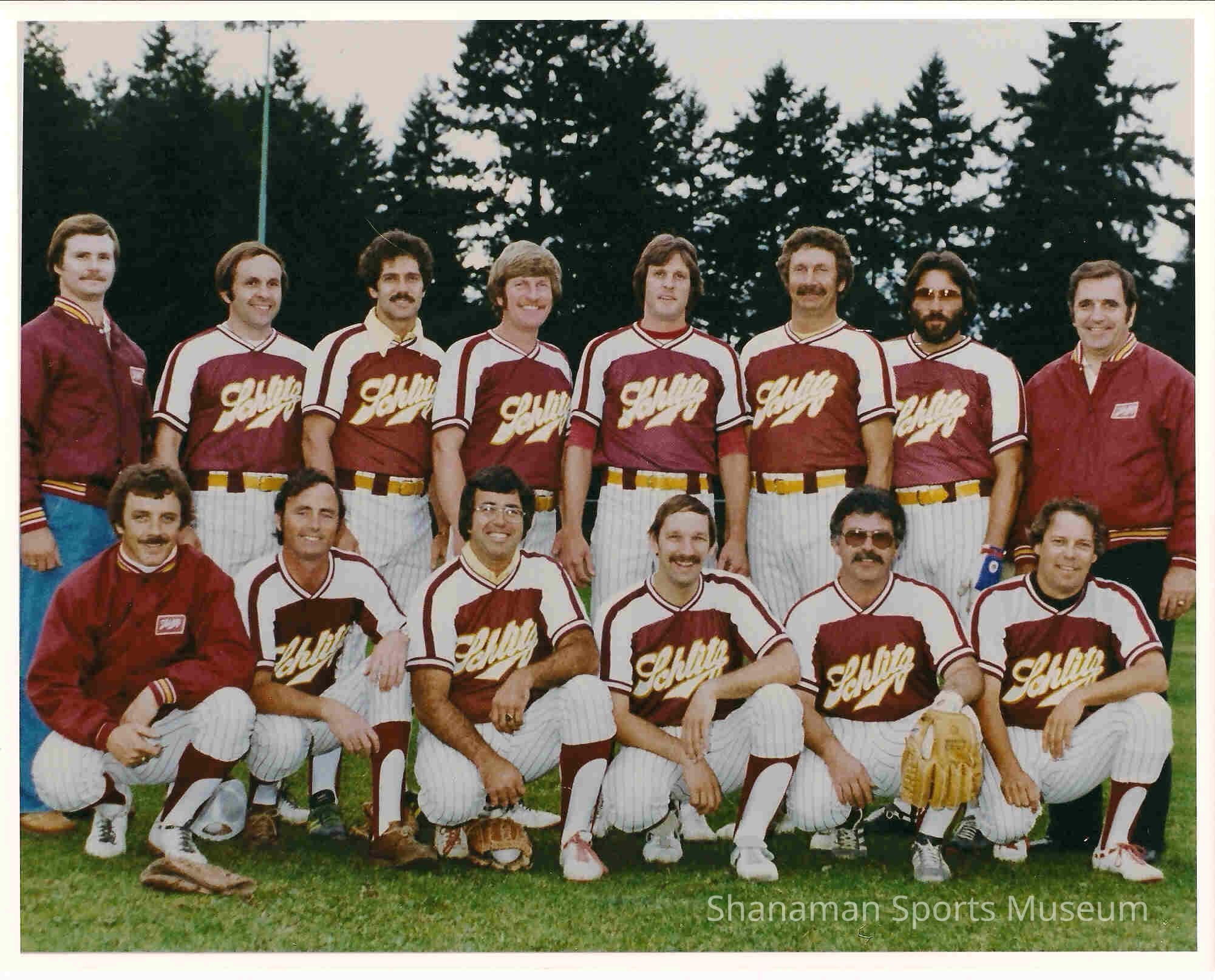 A colored photograph of the Schlitz Slowpitch team. The Puget Sound area has had many recreational leagues that provided a competitive atmosphere for the community and surrounding areas. Many former players in all sports used these leagues as a way to keep playing competitive sports while also providing ways to connect more the community.Lexicon