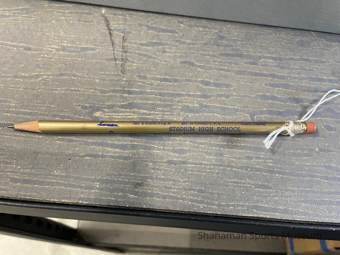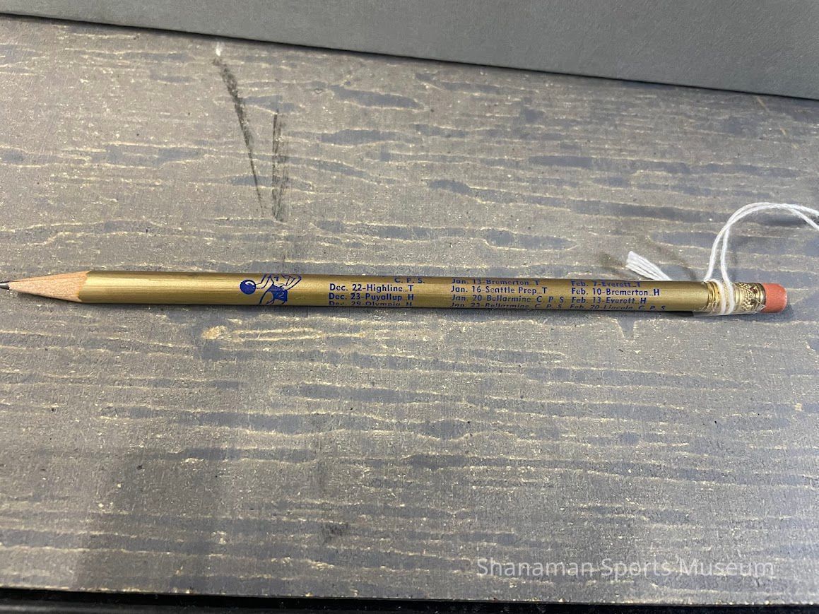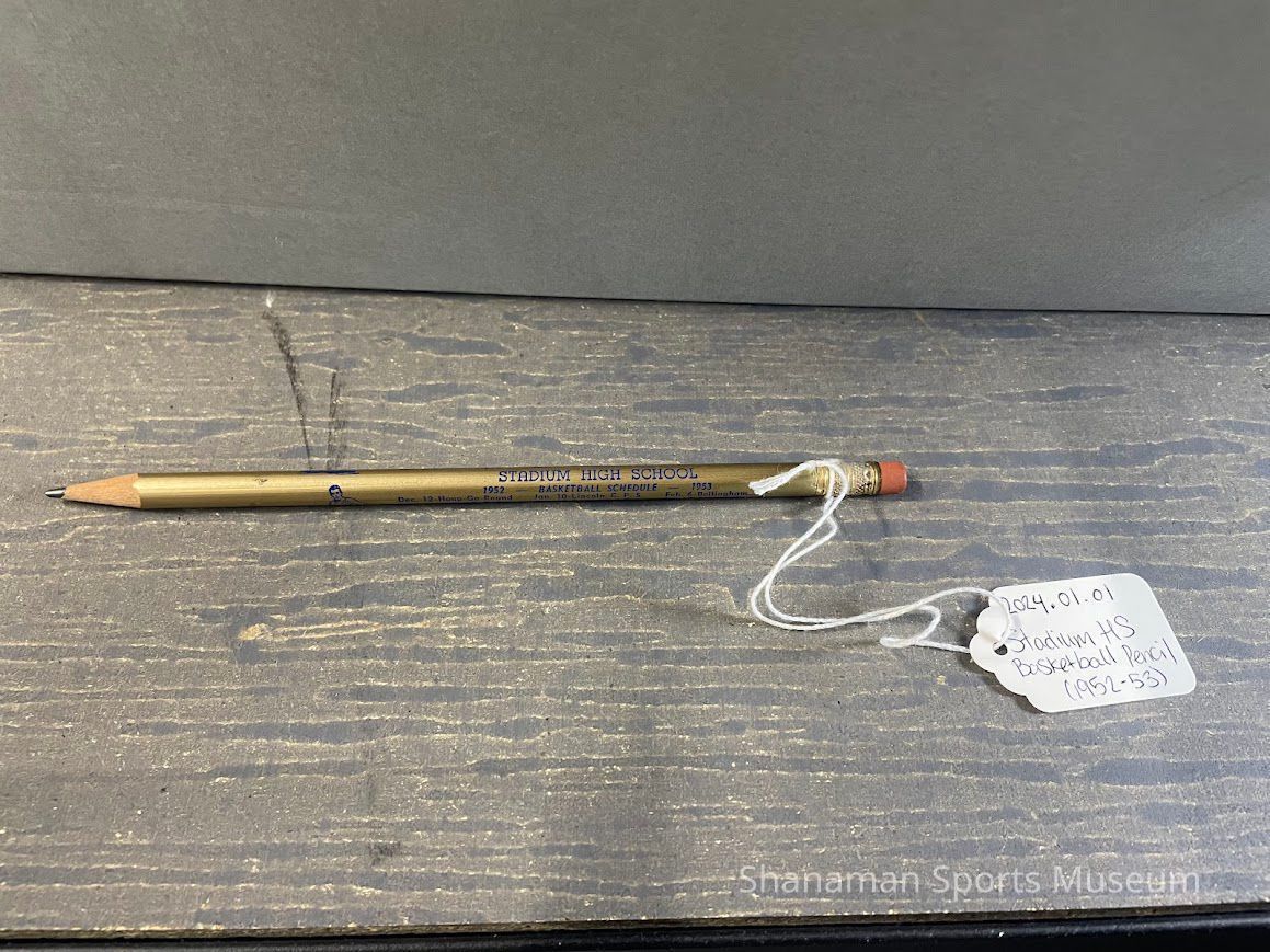 A gold pencil with the 1952-53 Stadium High School basketball schedule imprinted on it in blue. The pencil is sharpened but otherwise intact, including an eraser. On the left side of the pencil (towards the tip) there is a drawing of a basketball player in blue.