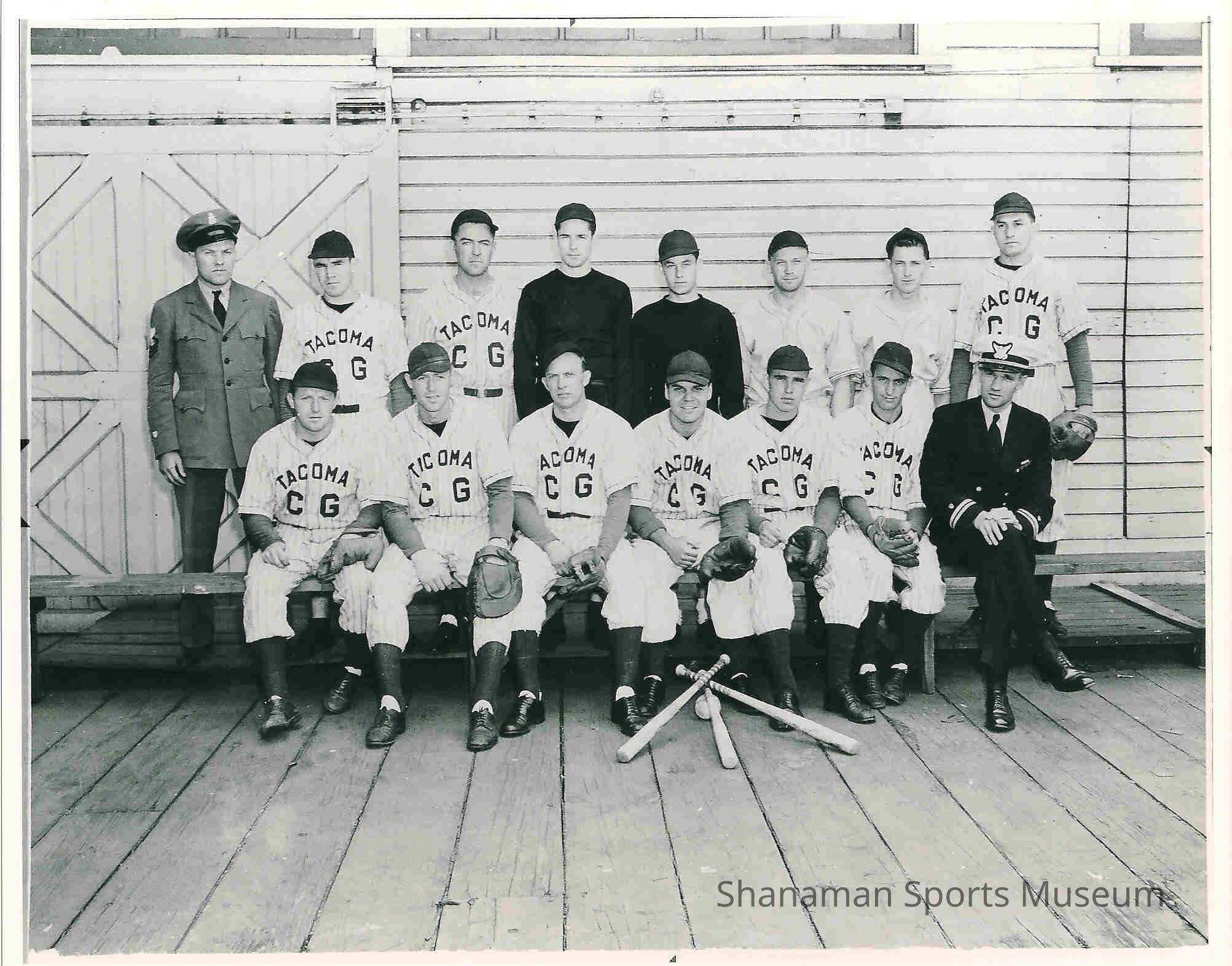 The Tacoma Coast Guard fastpitch team photo from the 1940s. Woodrow Red, who is dressed in black and is in the middle of the back row on the left, is considered to be among the best fastpitch pitchers ever to play in Pierce County. Stationed with the Coast Guard in Tacoma, he pitched for Worthen Bank and led them to regional championships in 1941 and 1942. From 1946 to 1970, he was selected to an all-star team almost every year. Red signed with the Detroit Tigers out of high school and played briefly for them in the minor leagues.Lexicon