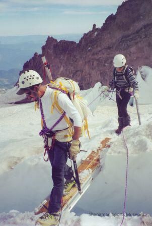 Jason Edwards, one of only eight guides to climb Mount Rainier more than 300 times, leads the way over a crevasse as Bronka Sundstrom of Ashford makes her way to Rainier's summit. On this Aug. 31, 2002, trip, the 77-year-old Sundstrom became the oldest woman to climb Rainier. Most people take two or three days to accomplish the feat, but Sundstrom needed only one. She and Edwards attempted to climb the peak again in 2003, but were unsuccessful. Sundstrom survived the Auschwitz and Bergen-Belsen concentration camps during World War II and met her husband, Ake, in a hospital in 1945. They moved to Tacoma in 1948 then Ashford in 1980. Bronka and Ake became fixtures on Rainier, regularly hiking to Camp Muir. Ake died in 2010 at the age of 93. Bronka kept going and has been seen hiking the slopes of Rainier as recently as 2018.Lexicon