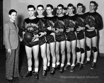 The Pacific Mutual Fuelers represented Tacoma in the 1941 Northwest AAU Tournament and one of their leaders was Lawrence “Lornie” Merkle, second player from the left. Merkle graduated from Bellarmine in 1936 and went on to become a Tacoma institution, even beyond sports. Merkle was a standout in football, basketball, baseball and tennis, where he was city champion in both singles and doubles and he played the sport well into his 80s. He was also a respected umpire and called games in the Pacific Coast League at Cheney Stadum and Seattle Sick’s Stadium. Among Merkle’s basketball highlights was his time leading high-achieving amateur teams and also playing against the Harlem Globetrotters. Merkle was also known for his larger-than-life personality and sense of humor. A longtime circulation supervisor for the Tacoma News Tribune, Merkle was known for his pink Cadillac and was said to have quit a job in his younger days as a fire fighter when a call would have forced him away from watching a televised football game. Photo by Wm. Heyer Jr., Tacoma.Lexicon