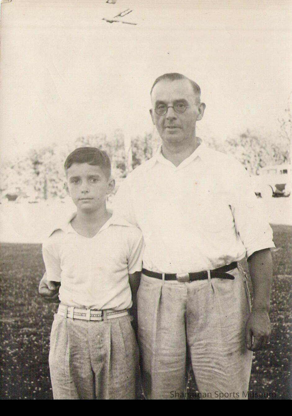 Holding four trophies and his bow, Harry “Sonny” Johns Jr. stands by a bulls eye target that he's nailed six arrows in dead center. Johns Jr. was a young and talented shooter with a bow and arrow. He won the National Archery Championship in San Francisco in 1938. The first national championship held under that name occurred in 1931. Events in the outdoor championships involved fixed targets at set distances.