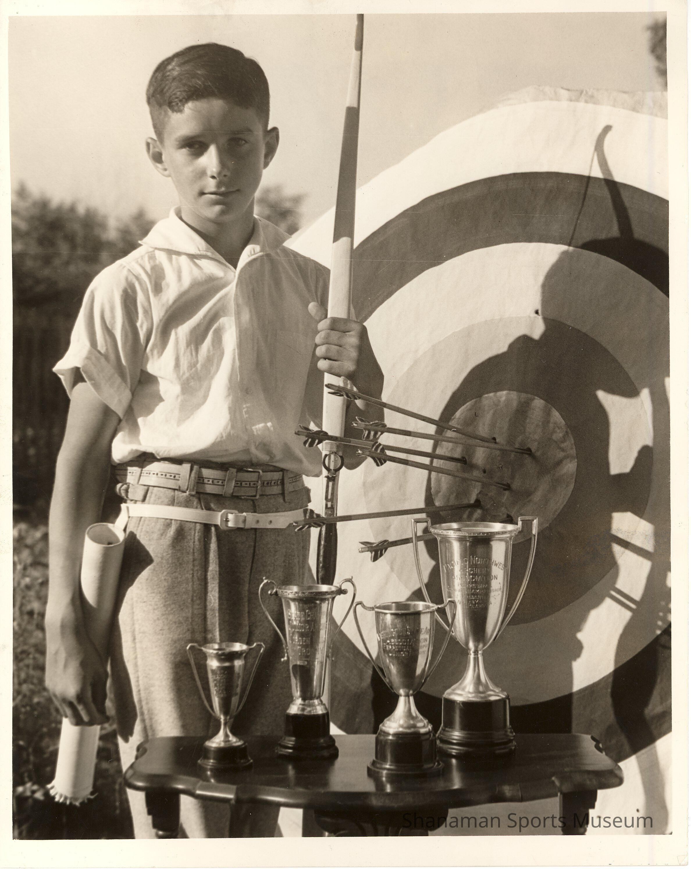 A young Harry “Sonny” Johns Jr. stands holding his bow and arrows next to a target. He was a marksman with the bow as he won the Pacific Northwest Archery Championship. In 1938, he won the National Archery Championship. Four of the trophies Johns won are on the table next to him. Johns wasn't a one-time splash as he won the Washington State Archery Association's Junior Championship from 1937 to 1940.Lexicon