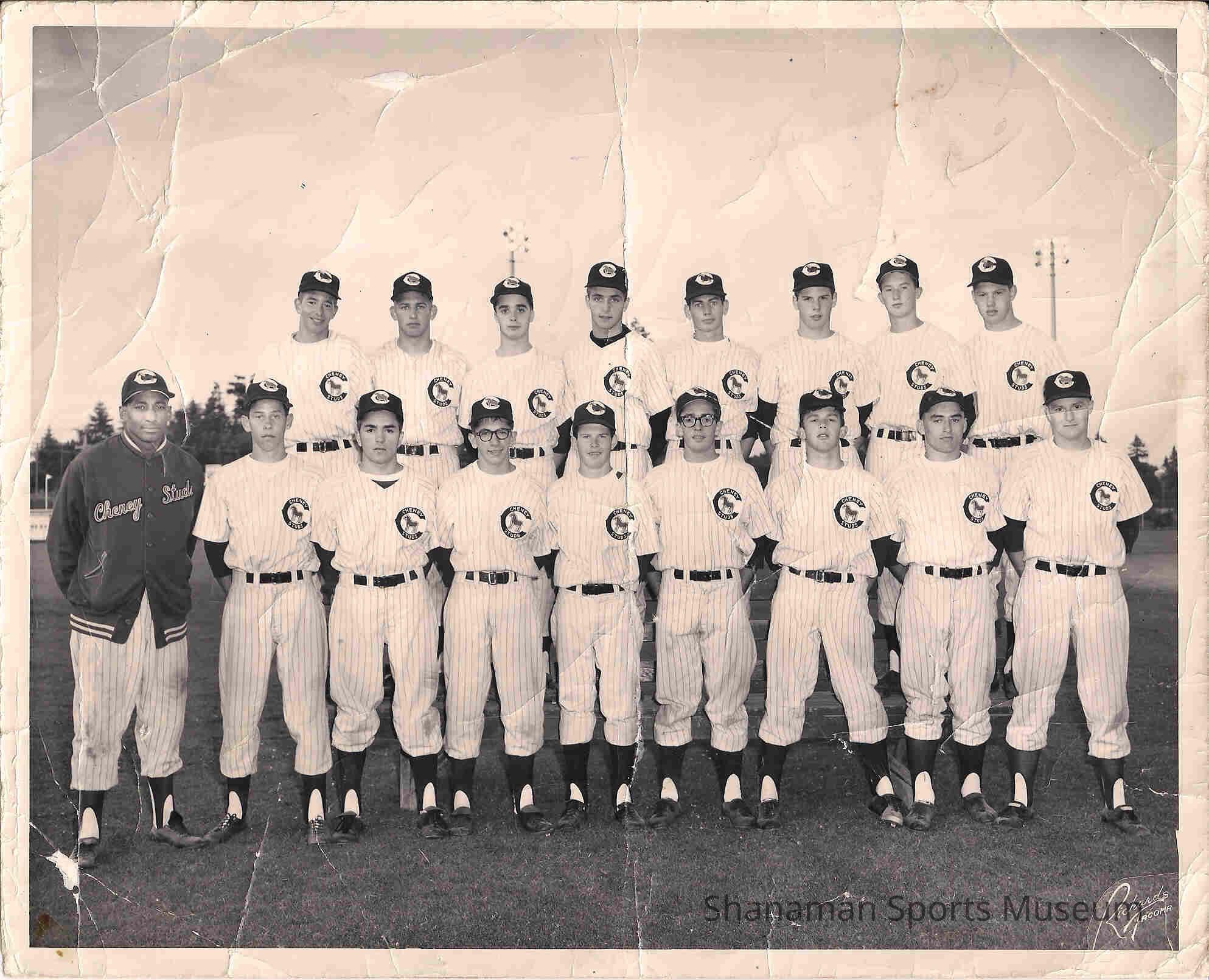 The Cheney Studs football team poses in their team uniforms, including coach Bob Maguinez at left. The Cheney Studs were part of a larger organization and were sponsored by sports enthusiast and philanthropist Ben Cheney. Cheney himself was an avid baseball fan but came from a low-income family who couldn’t afford his own baseball gear. Cheney grew up to sponsor numerous teams, of both sexes, and by his death in 1971 it was estimated Cheney had helped more than 5,000 youth through sponsorship by the Cheney Lumber Company, which was founded by Cheney in 1936. The youth program also included baseball, hockey, and basketball and started in the mid-1950s. The Studs baseball team made their first trip to the AABC Nationals in 1954, again in 1955 and won the championship in 1960. Coach Bob Maguinez at left. Phooto by Richards Studio.