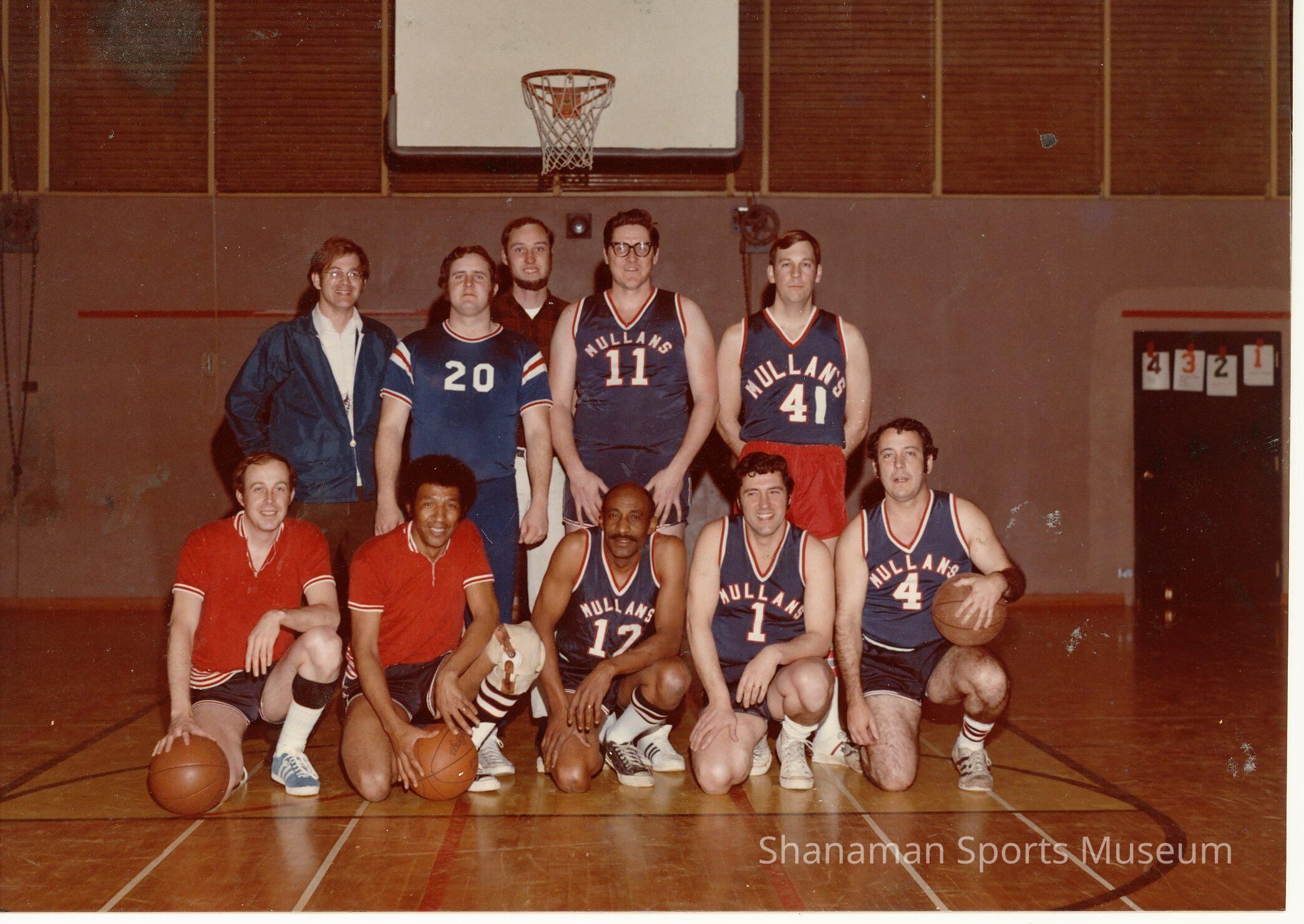 The Mullen men's basketball team posing for a team photo. Bob Marguinez front and center in the team photo.Lexicon