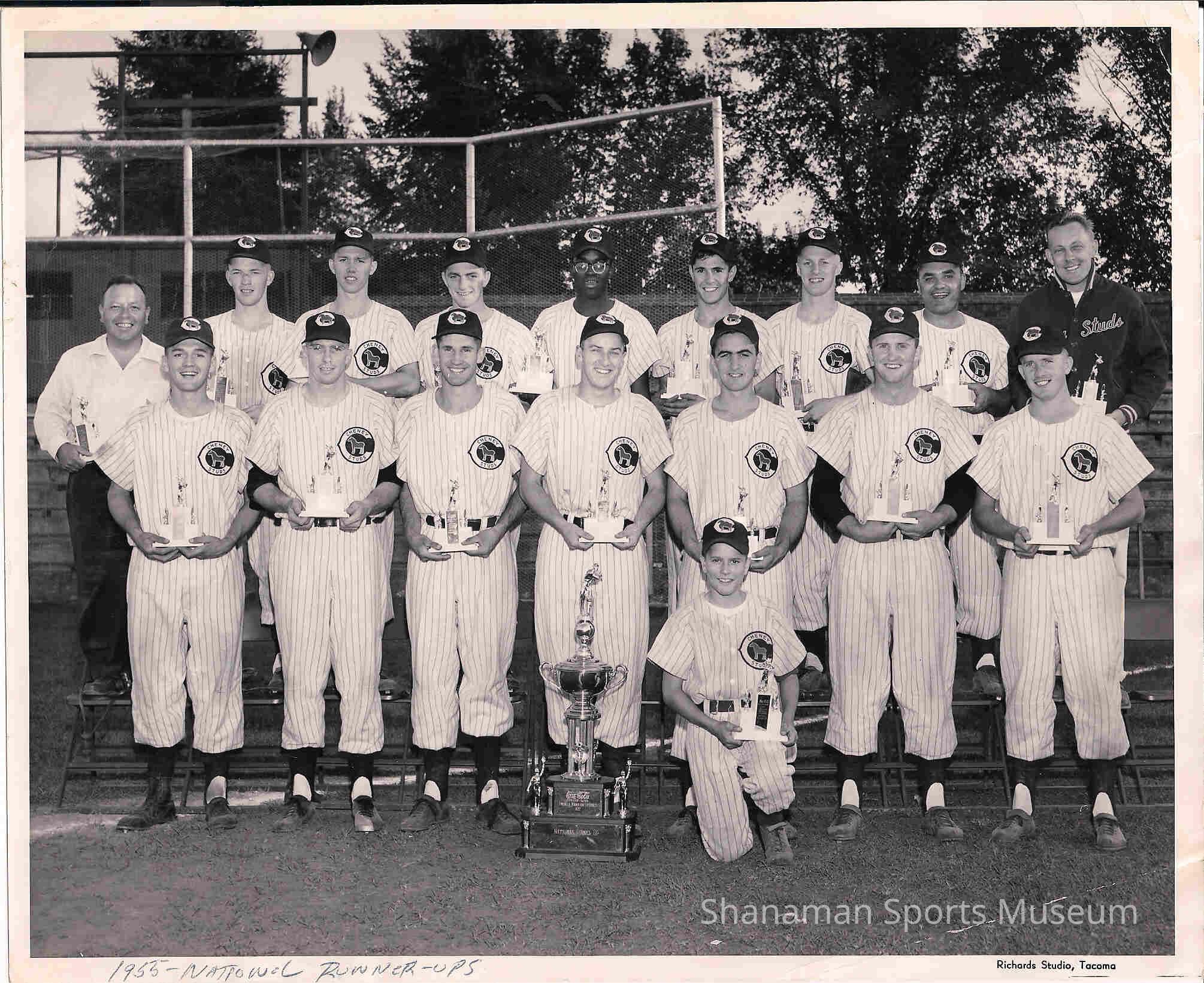 Photograph, original, b/w. Cheney Studs. Team photo with trophies, 1955 National ABC Runners Up. Ben Cheney back row, left. Richards Studio.Lexicon