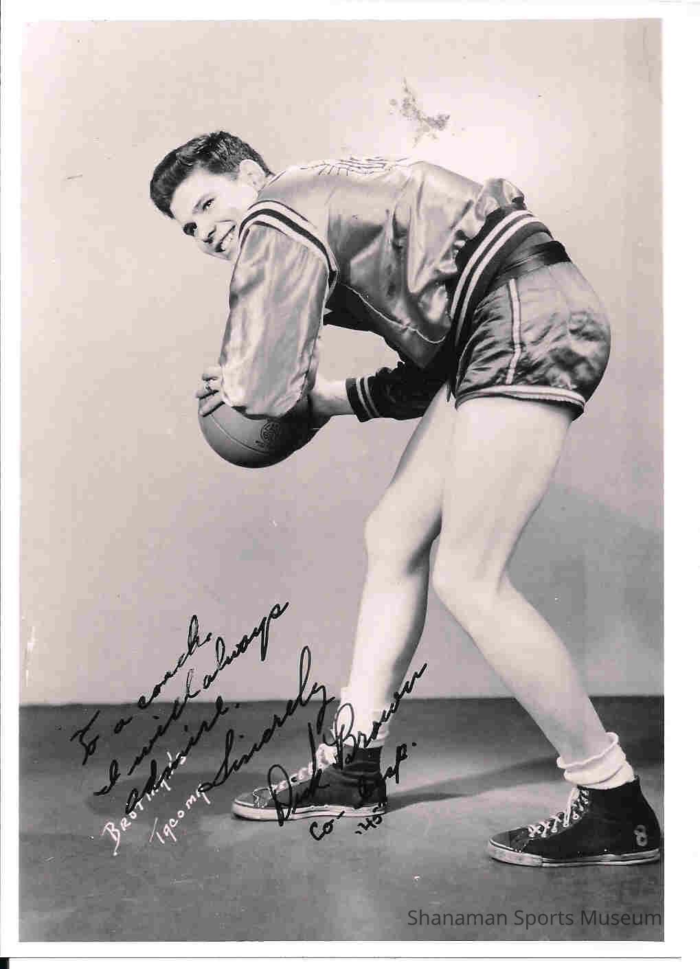 Dick Brown poses in his Stadium High School boys basketball gear in this 1945 photograph. He signed it in the lower left corner, "To a coach I will always admire. Sincerely, Dick Brown." Stadium qualified for the Class 4A state tournament that season.Lexicon