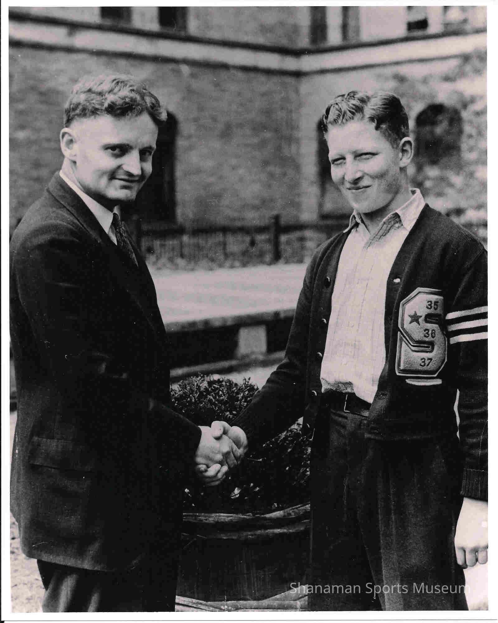 Basketball Coach David Lowman (left) shakes hands with a Stadium High School (Tacoma) student wearing a letterman's sweater in this 1937 photo taken outside of the school. The student apparently lettered in 1935, '36 and '37. The Tigers qualified for the Class 4A state basketball tournament in each of those seasons.Lexicon