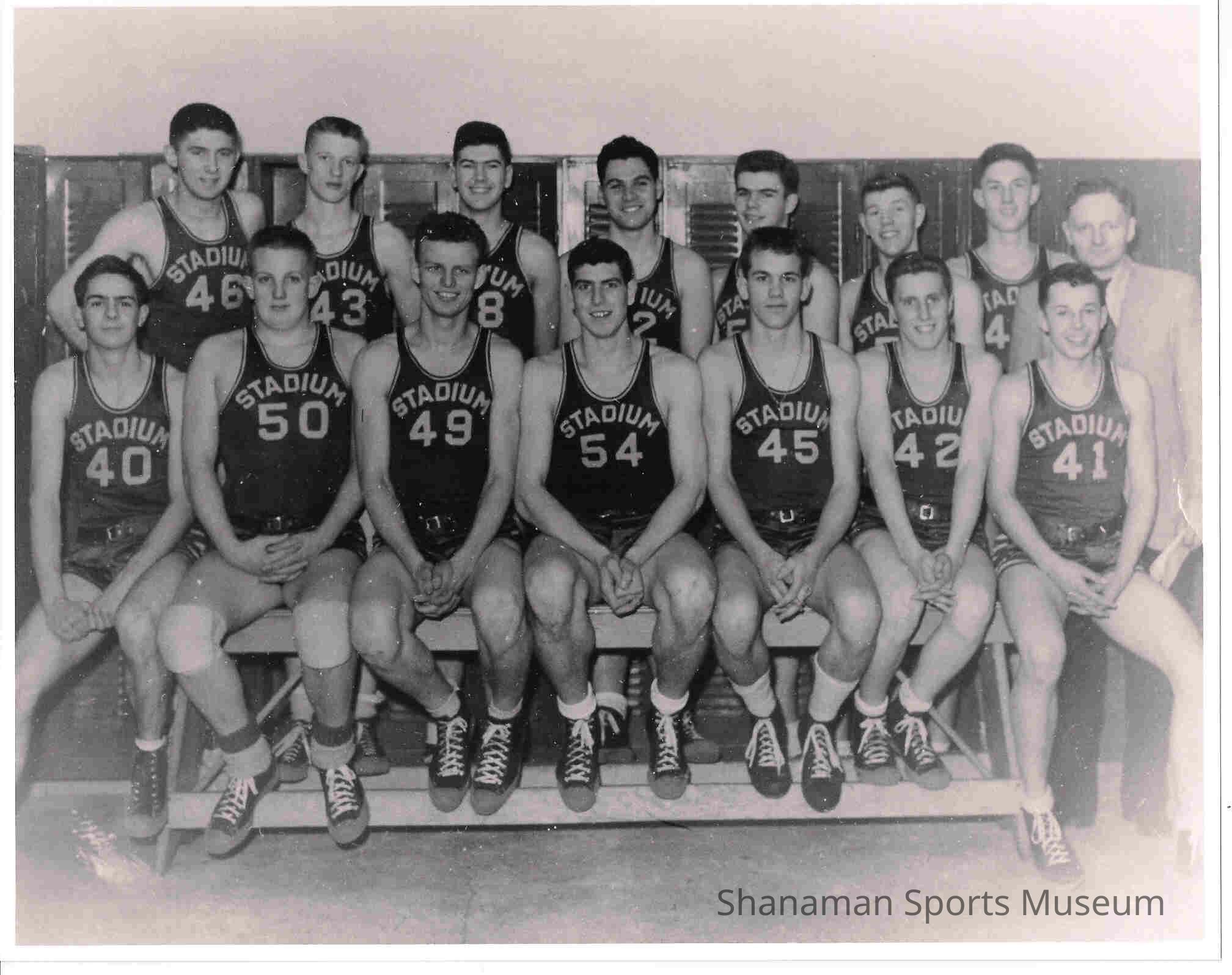 This photo of a Stadium High School (Tacoma) boys basketball team was taken in the locker room (date unknown). Coach David Lowman is standing at the far right.Lexicon