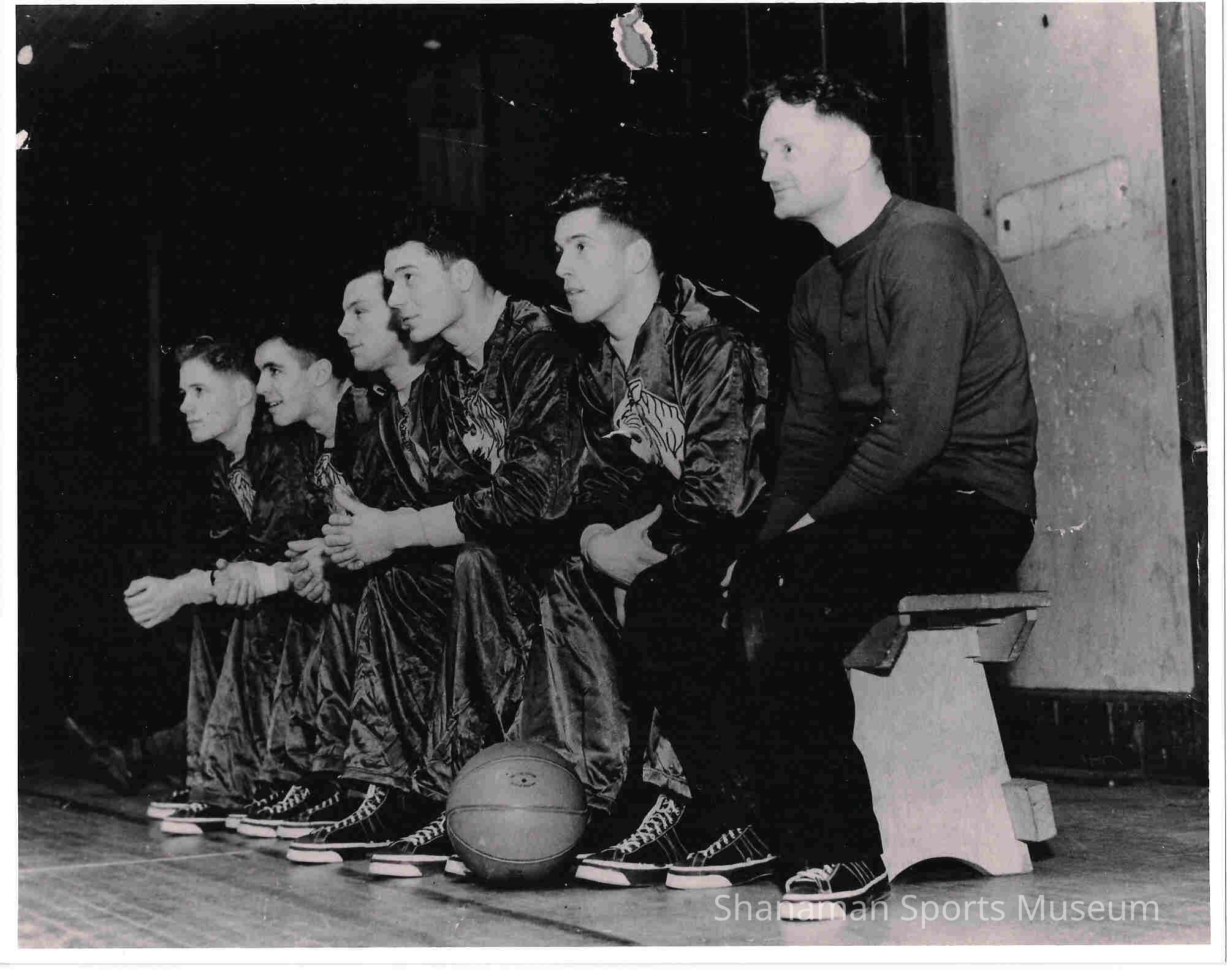 Coach David Lowman (far right) looks out onto the basketball court while sitting next to five of his his Stadium High School (Tacoma) players, who are outfitted in their warmup suits. No date is provided.Lexicon
