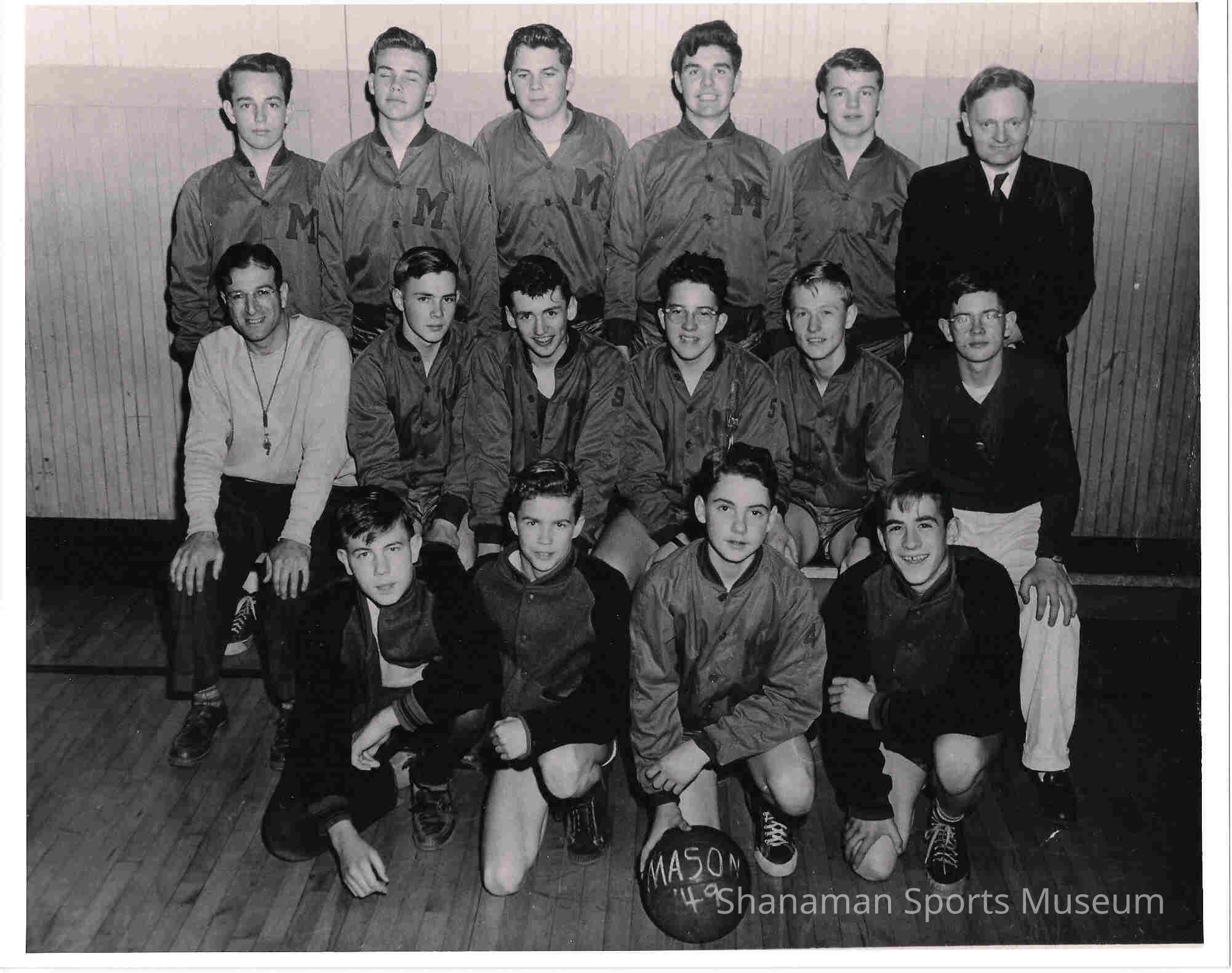 Members of the 1949 Mason Junior High School boys basketball team in Tacoma are pictured in warmup jackets. Coach David Lowman is in the back row, far right. Coach Angelel (first name not available) is in the second row, far left (wearing a whistle).Lexicon