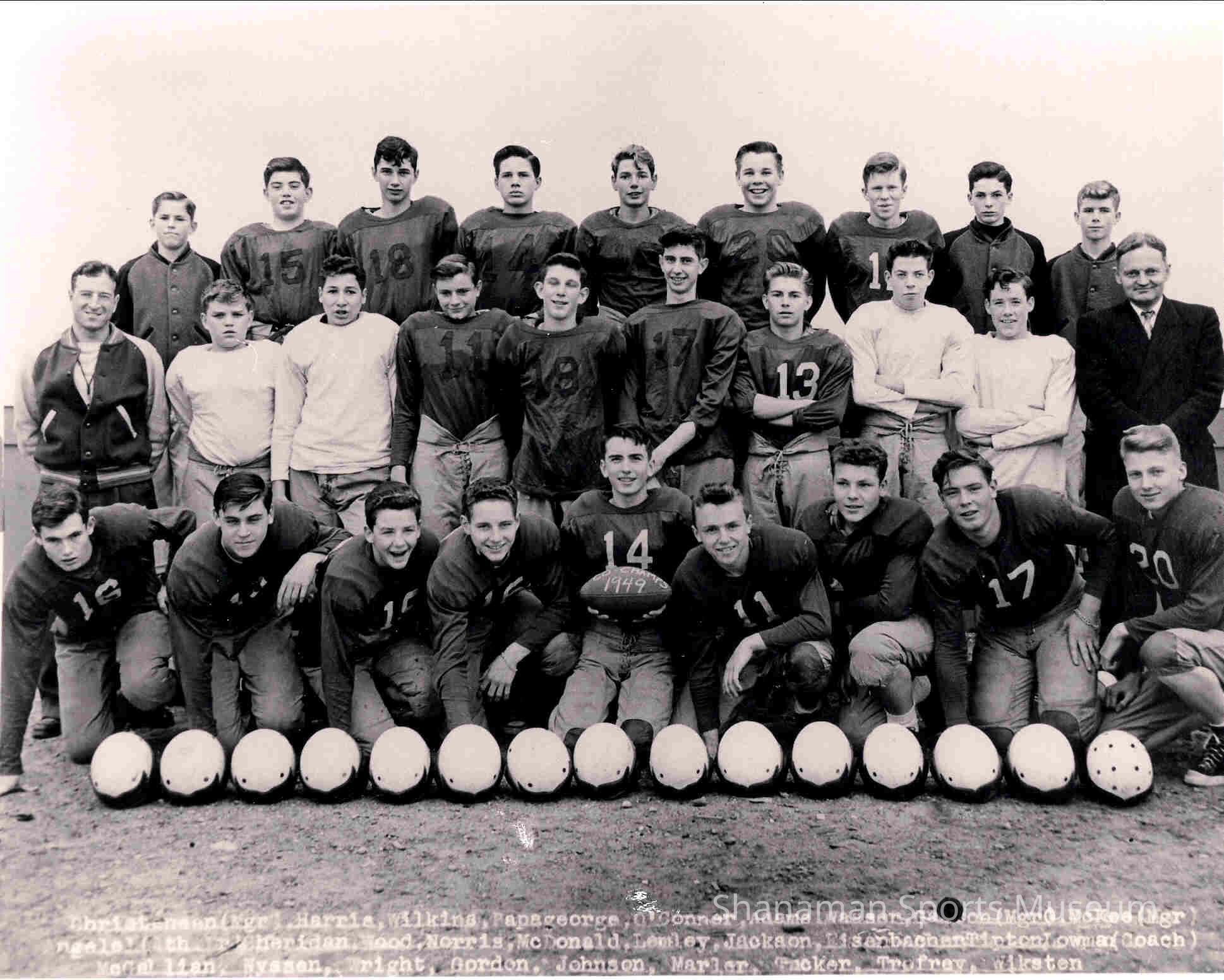 Players and coaches, believed to be from the 1949 Mason Junior High football team that were league co-champions, pose for a team photo. At the end of the middle row were coach Angelel, left, and coach Lowman (right).Lexicon