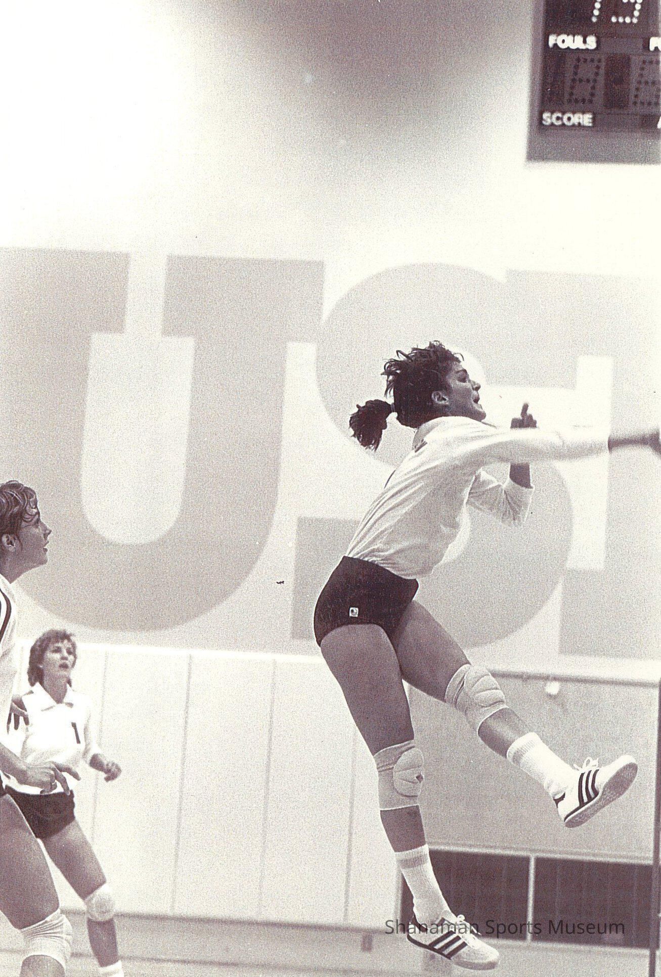 Photograph, b/w, scanned reproduction. Action shot of Julie Kurrus McGovern (UW) jumping to hit the volleyball as two team members watch.Lexicon