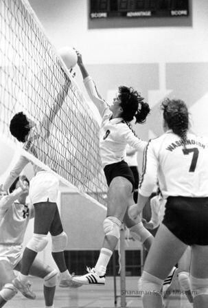 Photograph, b/w, scanned reproduction. Action shot of Julie Kurrus McGovern (UW) jumping and reaching over the net, touching the ball.Relationships