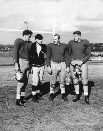 A black and white photograph of Stadium High School coach John Heinrick and three of his players standing together on a lightly cloudy day in front of a goal post. John Heinrick took over coaching the Tigers in 1934 turning the high school into a powerhouse program in the Northwest. The 1940 Stadium Tigers football team was on the tail end of their seven year run of winning the city championship (1934-1940) and dominated city rivals Lincoln High School in their annual Thanksgiving Day game during that span, where the Tigers outscored the Abes to a combined score of 114-to-14. In 1948, Stadium High School played in what was then termed as the “first East-West intersectional high school game” where the Tigers hosted Mooseheart, Illinois at the Stadium Bowl.Lexicon