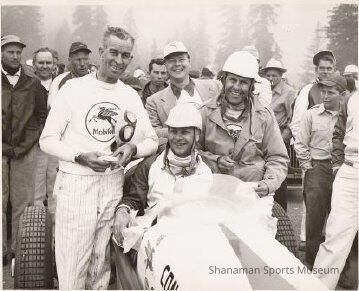 Holding his helmet, George Hammond stands next to some other race car drivers and a race car. Hammond was a popular racer over the years in Tacoma and a highlight came when he won the Pike's Peak Auto Race, a 12-mile gravel and paved race in Colorado and began back in 1916. Hammond, who was a part-time racer and a full-time tour bus driver, won the Pikes Peak race in 1952 driving the Kurtis Kraft and finishing. As of 2011, the race is fully paved. The race isn't on a flat track. It has an elevation gain of 4,500 feet, making it a challenge for Hammond to win. Bobby Unser won this race six straight years from 1958 to 1963.Lexicon