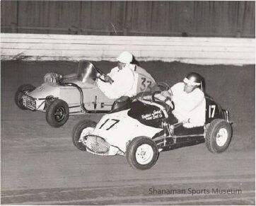 Photograph, b/w, original. Action shot of two midget cars racing. Car 33 Harry Holton (driver); Car 17 Bobby Hoskins (driver). June 1959? 1957Lexicon