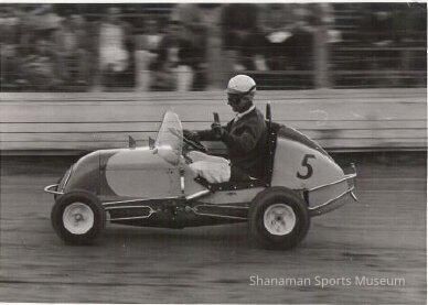 Photograph, b/w, original. Action shot of Ed Guth driving Bill Seidelman's car number 5. Guth gestures with left hand.Lexicon
