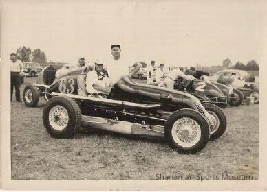 Photograph, b/w, original. Ralph Taylor seated in car number 63. Leo Dobry (owner) poses next to car. Other cars in background.Lexicon