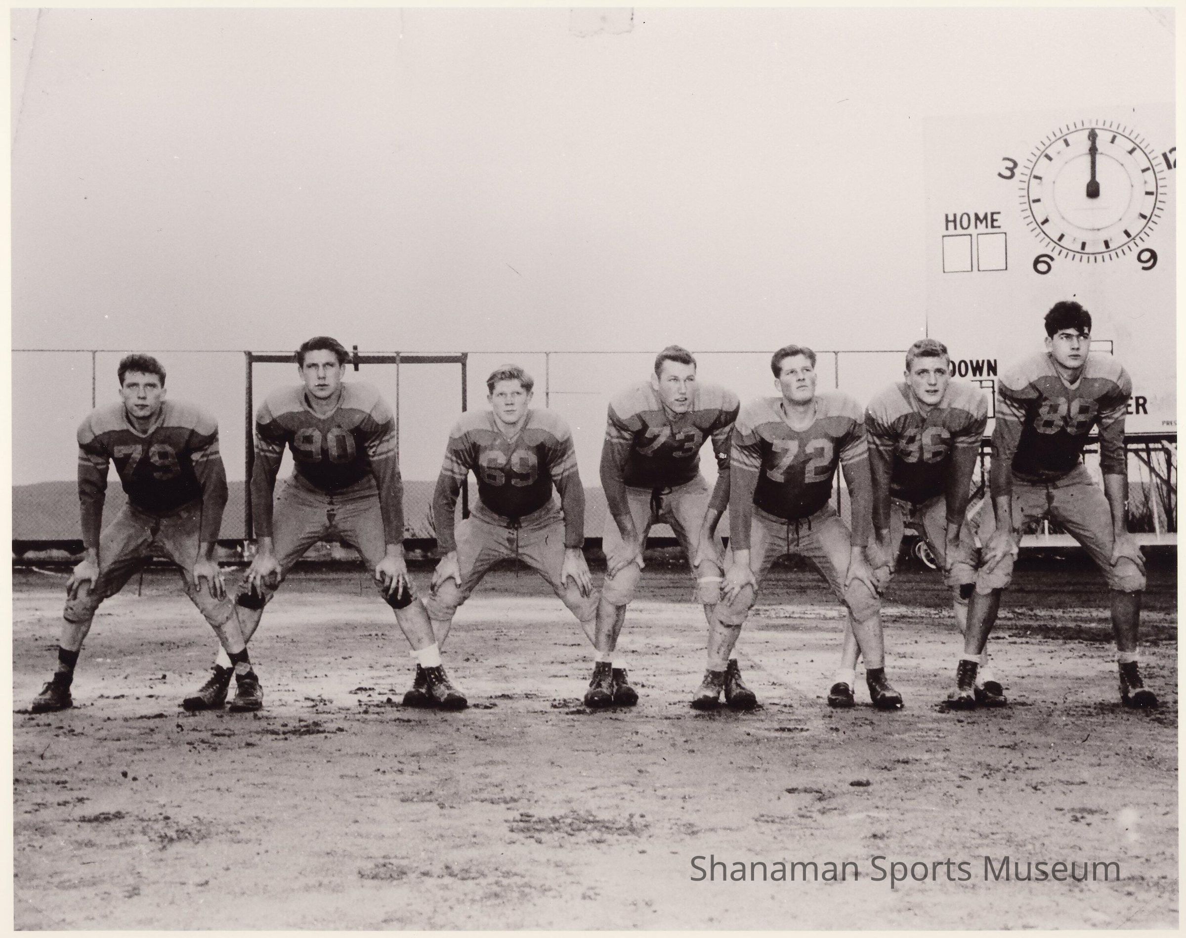 Photograph, b/w, original. Members of Stadium Tigers football team limber up prior to game in Stadium Bowl. Copy print on file. Bob Carlson (90), ? Maitland (88), Gary Friberg (73)Lexicon