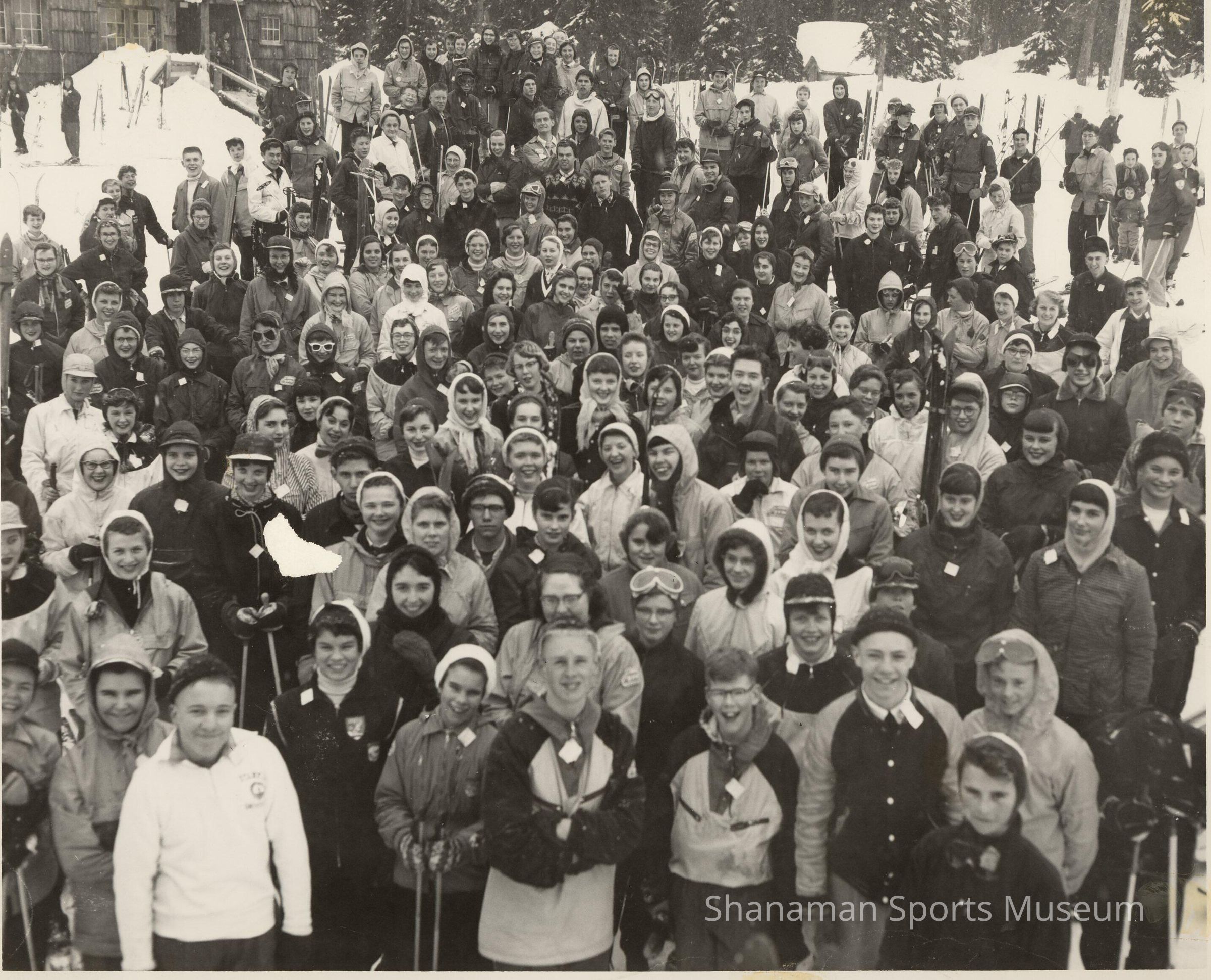 More than 100 youth skiers pose for a photograph at an unidentified ski slope.