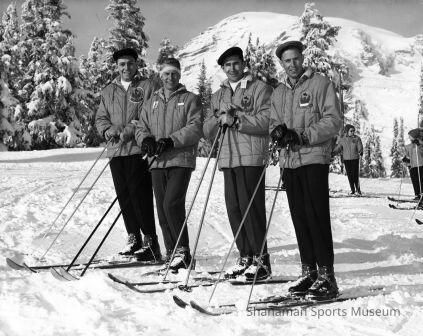 Jack Tangney, left, Stan Olsen, Joe LaPorte and Dick Vanderflute pose for a picture at Paradise in Mount Rainier National Park. The men worked as Tacoma Ski School instructors at Paradise. Paradise was home to America's first ski school, founded by filmmaker and skiing pioneer Otto Lang.