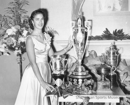 Photograph, B/W, original. Pat Lesser posing next to trophy, 1955, U.S.G.A, Western Amateur.Relationships